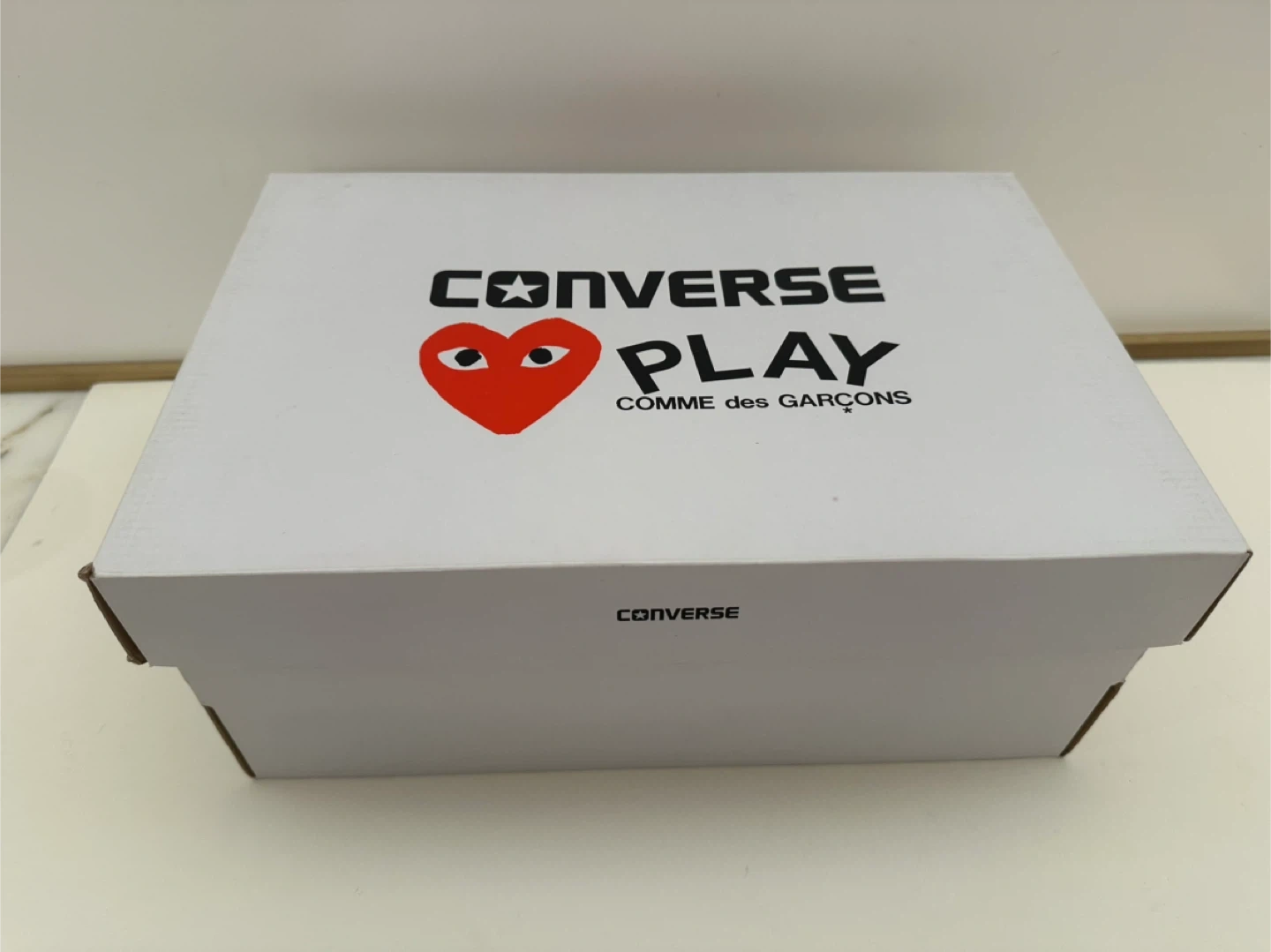 Selling a pair of Converse PLAY Comme des Garçons high-top sneakers in pink! They are a size 5 and come with the original box. The shoes have the iconic heart with eyes logo. They are in good condition and ready for a new owner!