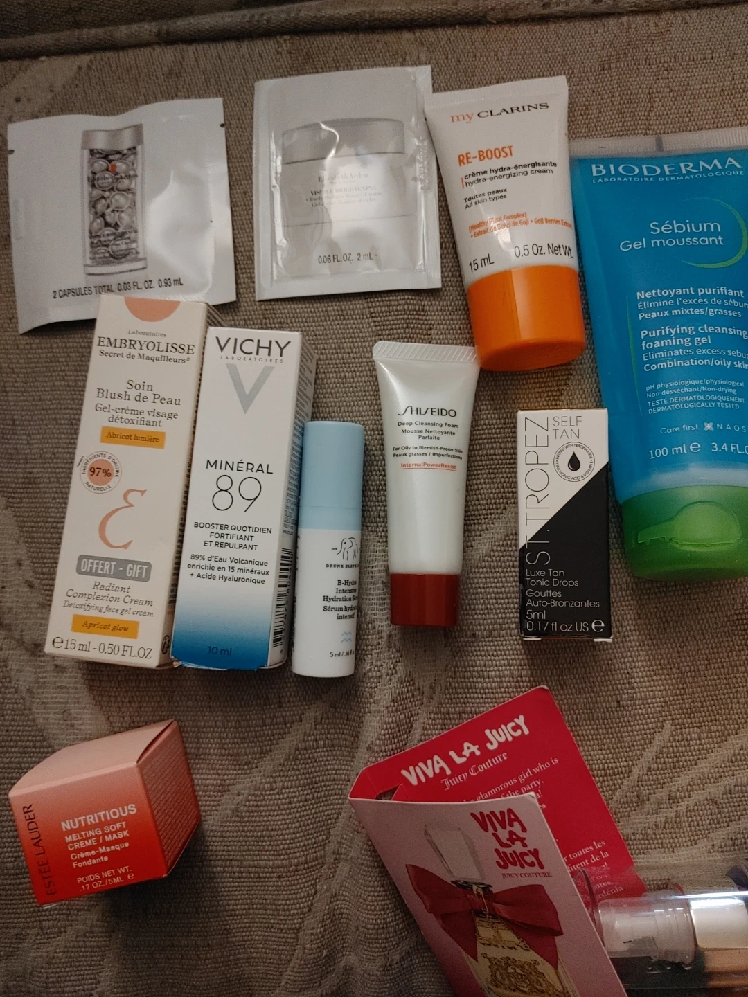 This is a collection of various skincare samples from brands like Estée Lauder, Embryolisse, Vichy, Shiseido, My Clarins, Bioderma, Drunk Elephant, and St. Tropez. Includes creams, serums, and cleansers. Great for trying out new products! Includes shampoo samples, lip products, lip care and blush. Some samples are full sized. Bath bombs, perfume, body mist and a cute small pink back pack!