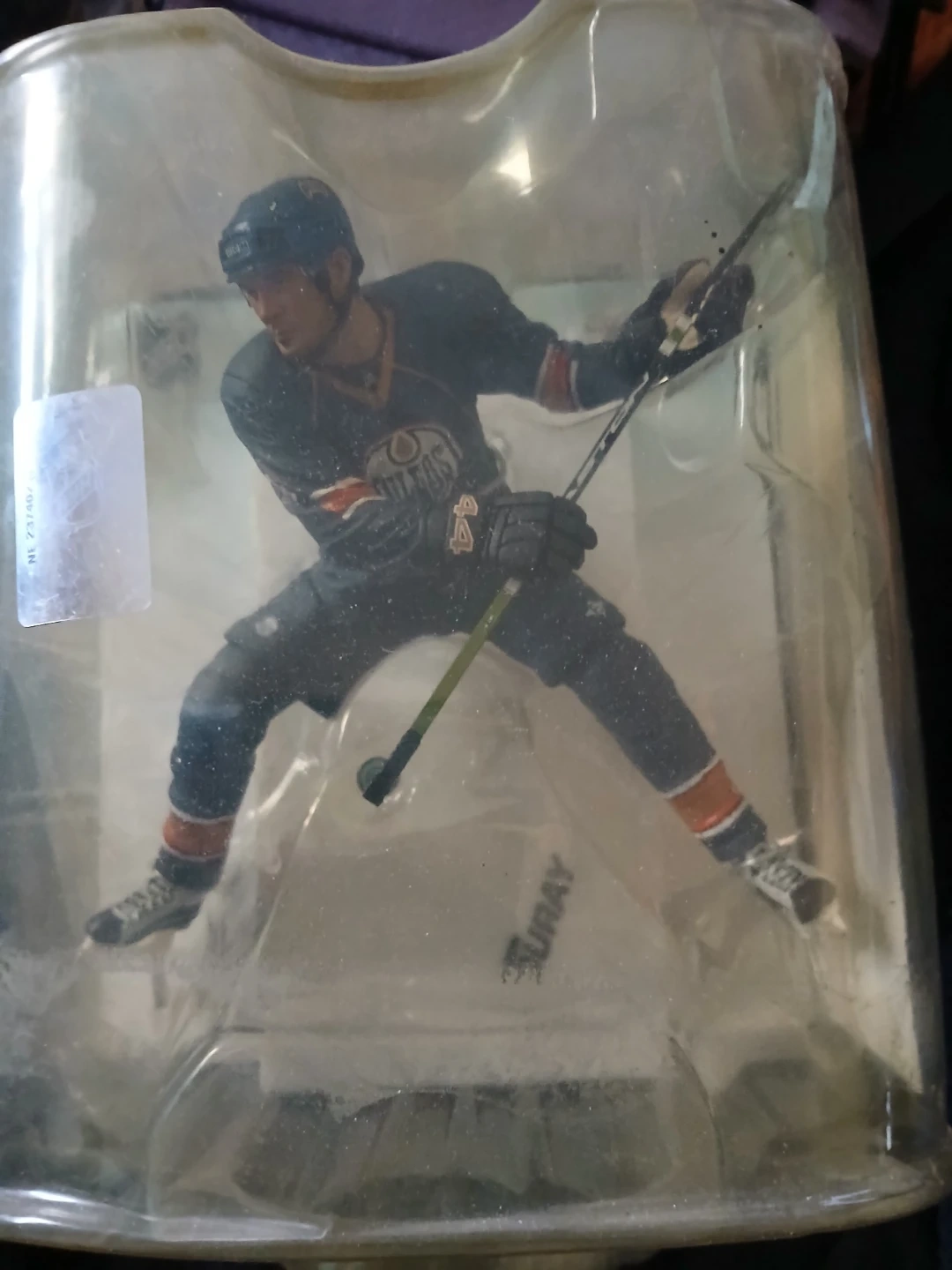This is a Sheldon Souray action figure in his Edmonton Oilers uniform. It's packaged in a clear plastic display case.