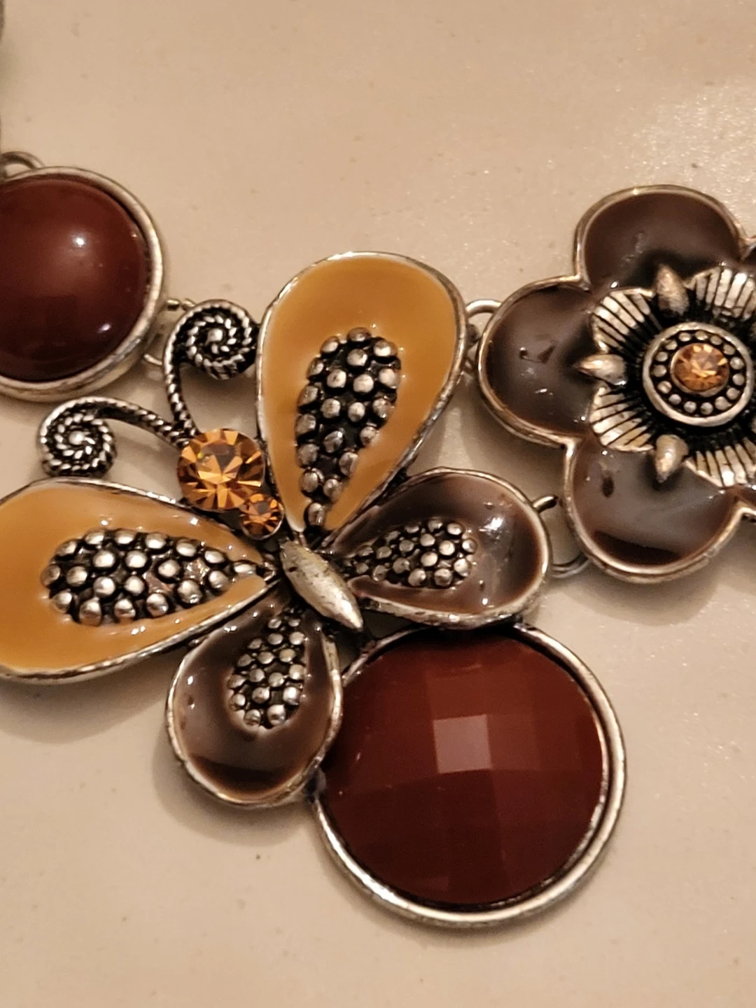 Pretty vintage necklace with a floral and butterfly design. It features brown and tan enamel flowers, maroon beads, and a butterfly with amber-coloured gems. Silver-tone chain.