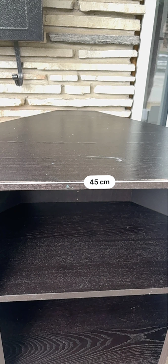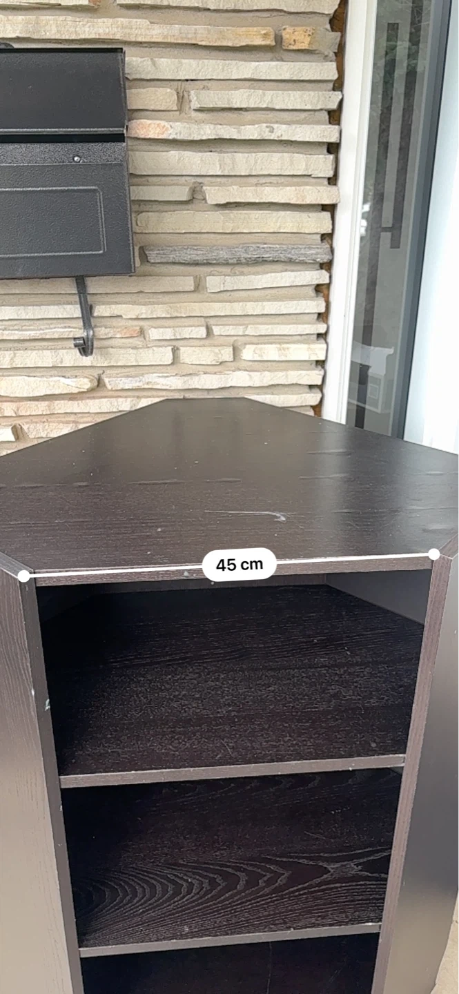 Dark brown corner shelving unit with three shelves. Measures 45 cm wide and 103 cm high. Shelf depth is 32 cm. It's perfect for organizing items in a corner space.