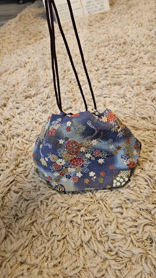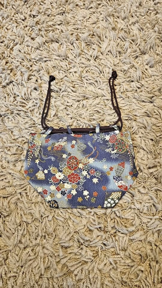 Vibrant little drawstring pouch with pretty blue fabric and colorful floral designs. Drawstring closure. Good for holding small items.
