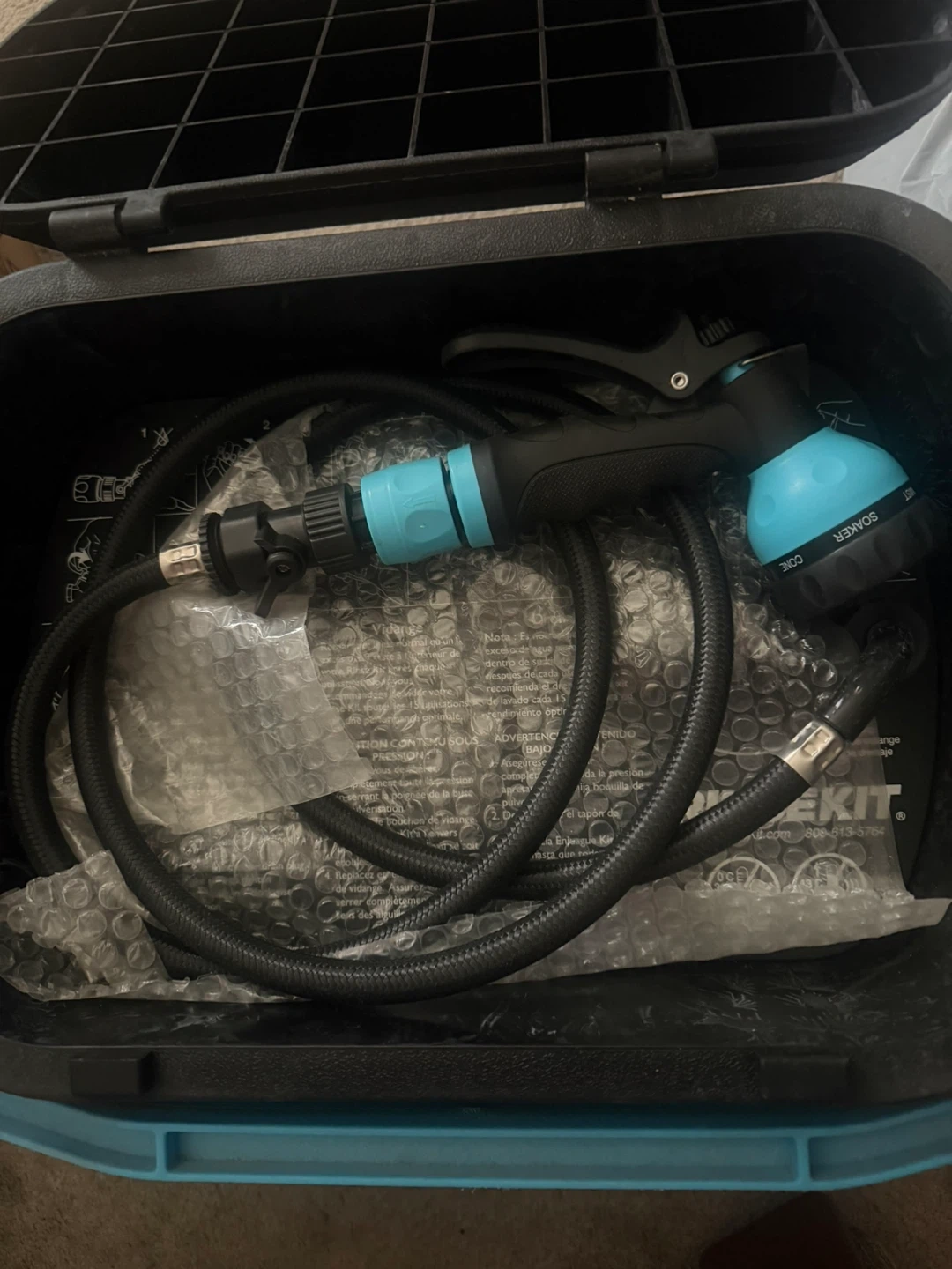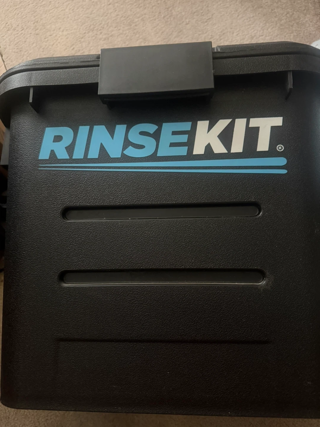 This is a RinseKit portable pressurized shower system. It holds 3.5 gallons and provides up to 5 minutes of shower time. The system offers powerful pressure for cleaning.