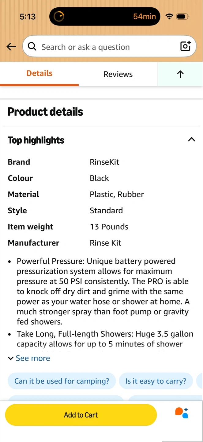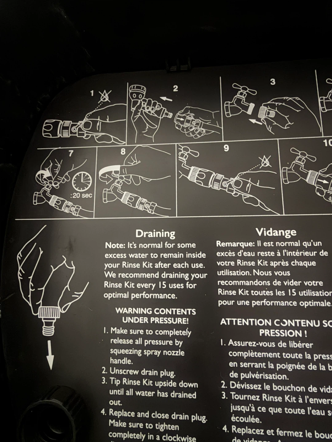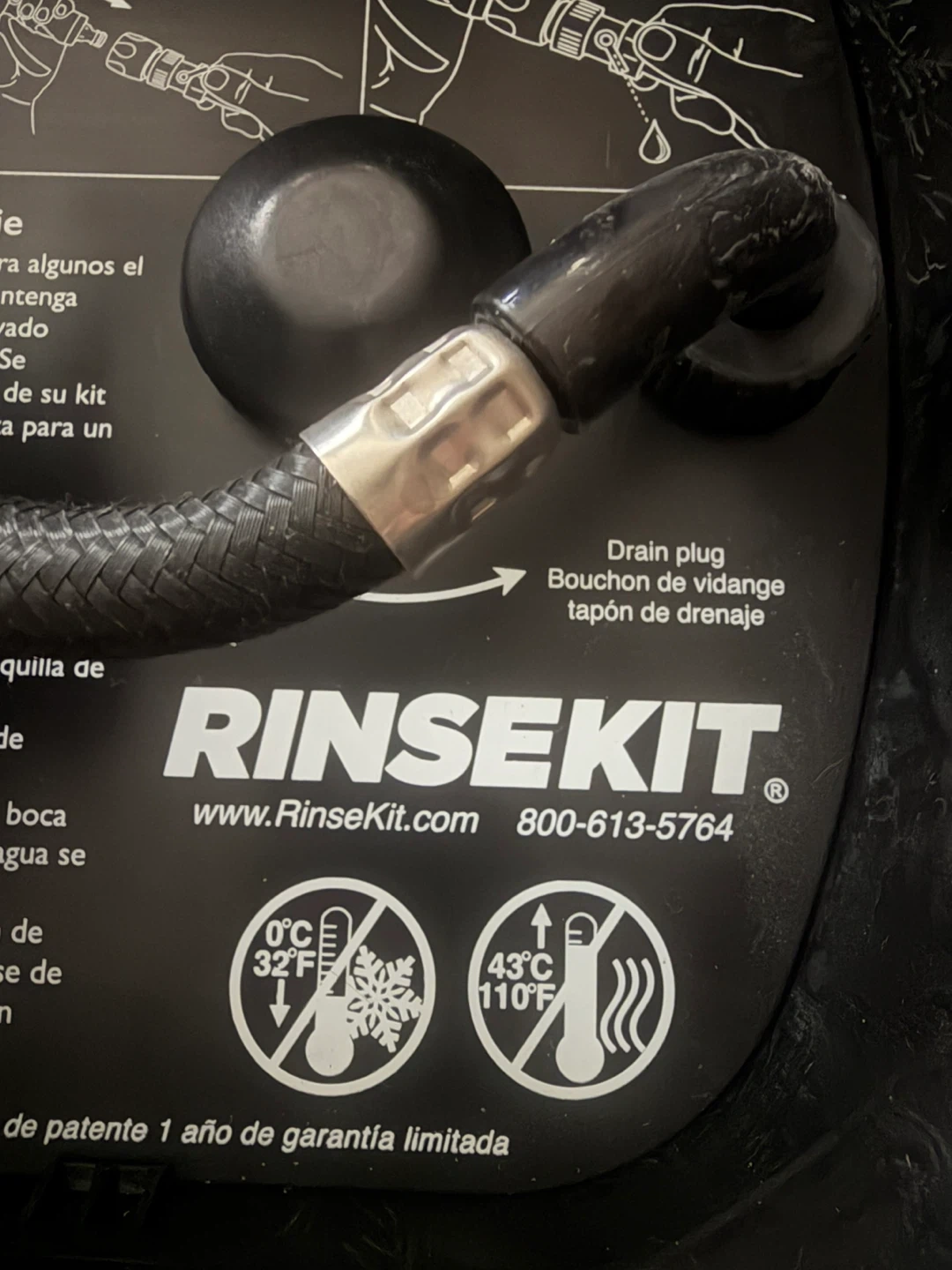 This is a RinseKit portable pressurized shower system. It holds 3.5 gallons and provides up to 5 minutes of shower time. The system offers powerful pressure for cleaning.