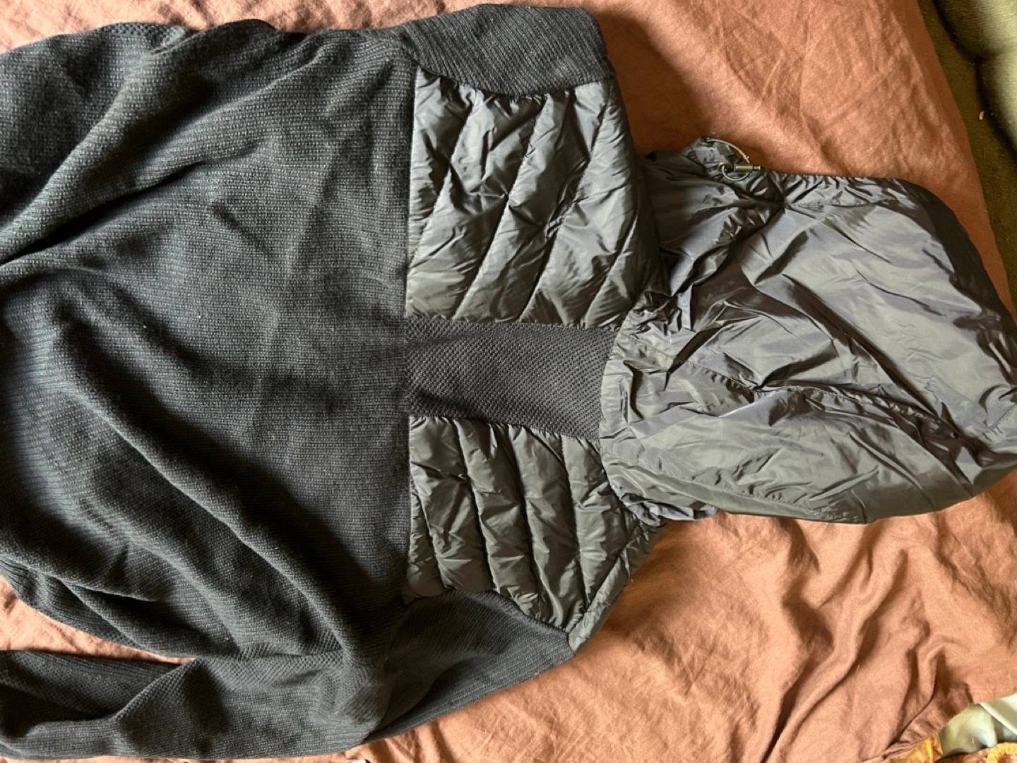 Men's navy blue Hybridge Knit jacket. Features a quilted down-filled section and a ribbed knit sweater design. Includes a hood. Excellent condition. Never worn, tags on.