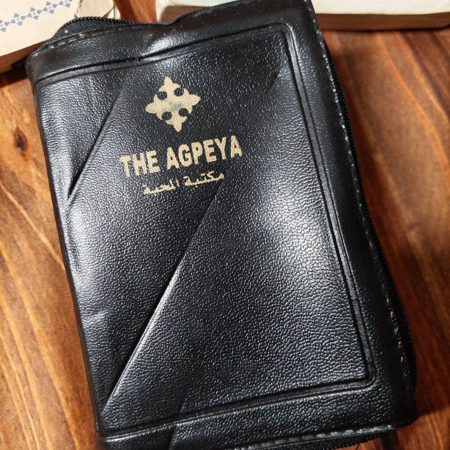 This is a lot of books containing The Agpeya Coptic prayer book. It's bound in black faux leather with a zipper closure. The book features various religious illustrations inside. Published by Mahaba Bookshop.