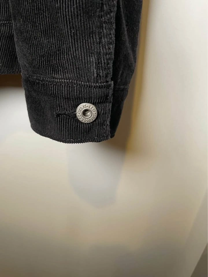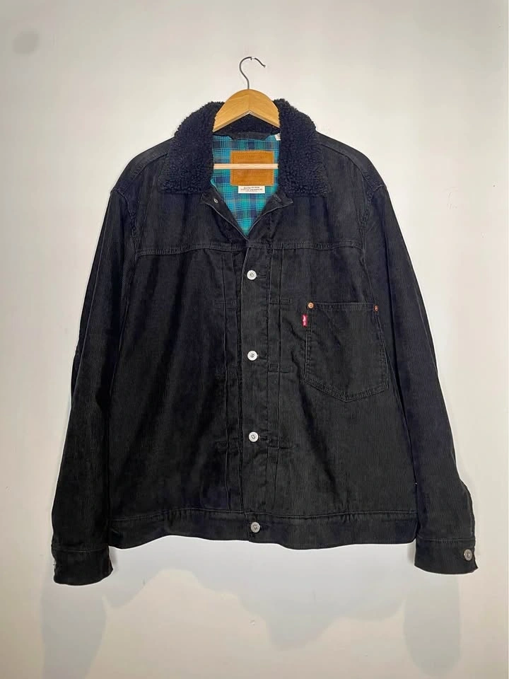 Selling a Levi’s Premium Sherpa-Lined Trucker Jacket in black corduroy. This is from the higher-end Premium line, featuring the iconic "Big E" red tab—a detail highly sought after for its superior construction compared to standard retail versions.