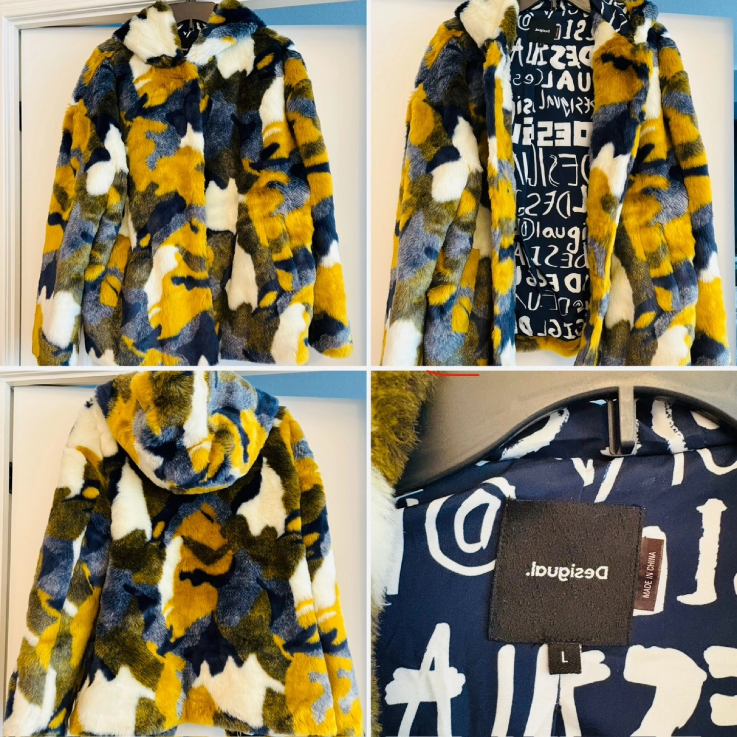 Snuggle up and look good doing it in this stylish Desigual faux fur jacket! It features a unique, eye-catching pattern, with a soft, comfortable lining. Size is L. Excellent condition, worn <5 times.