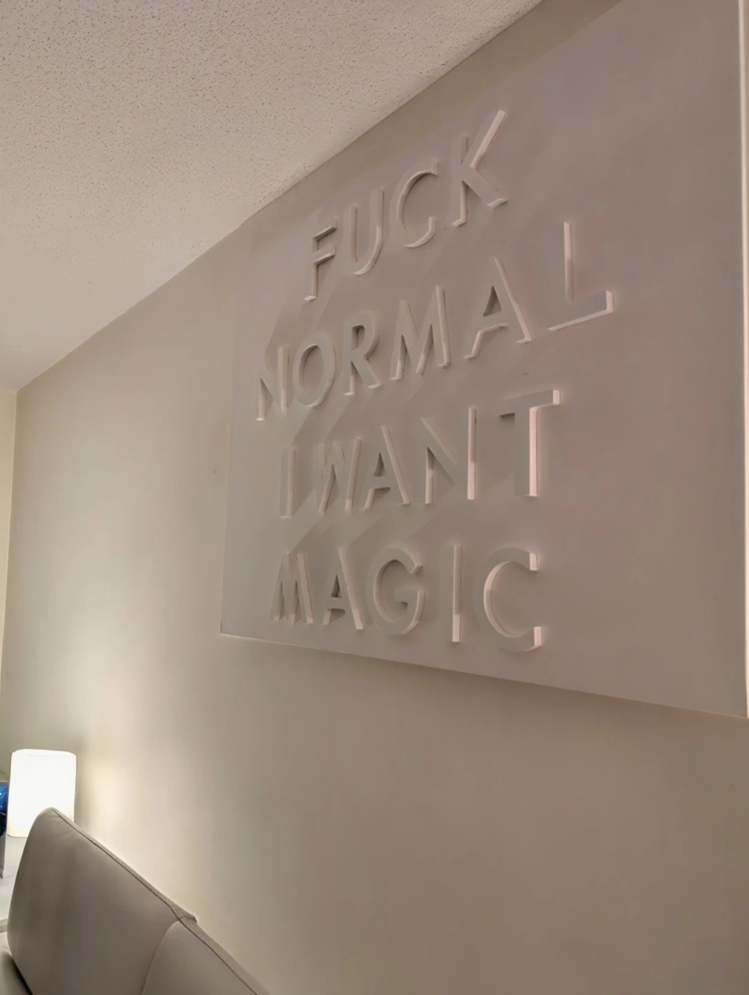 Personally handmade, 3D canvas art piece with the quote "FUCK NORMAL I WANT MAGIC" in raised wooden lettering. It measures 48 inches by 36 inches. Its bold statement makes it a unique decor item for any space!