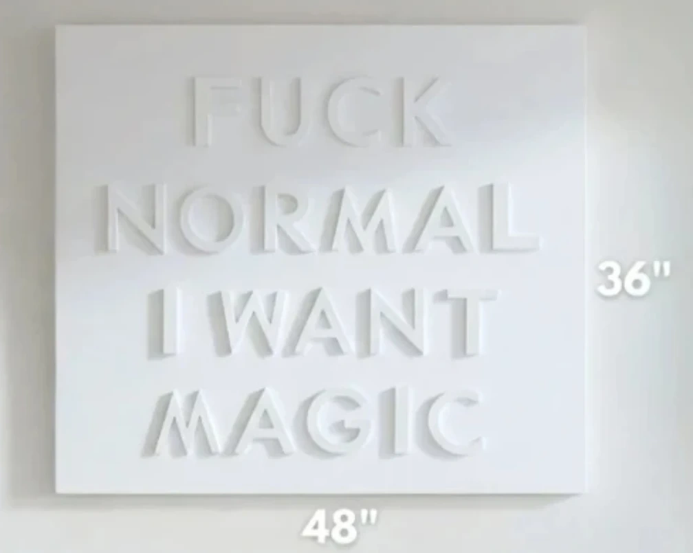 Personally handmade, 3D canvas art piece with the quote "FUCK NORMAL I WANT MAGIC" in raised wooden lettering. It measures 48 inches by 36 inches. Its bold statement makes it a unique decor item for any space!