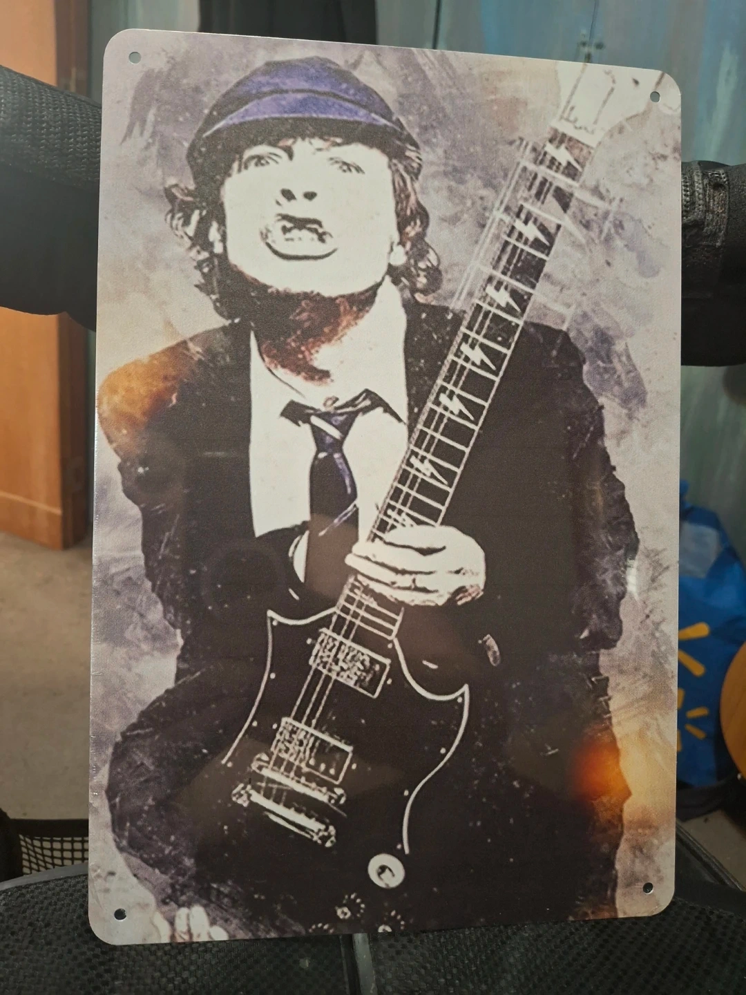 This is a metal sign featuring Angus Young from AC/DC. It's great for any rock music fan's collection. The sign has pre-drilled holes for easy mounting.