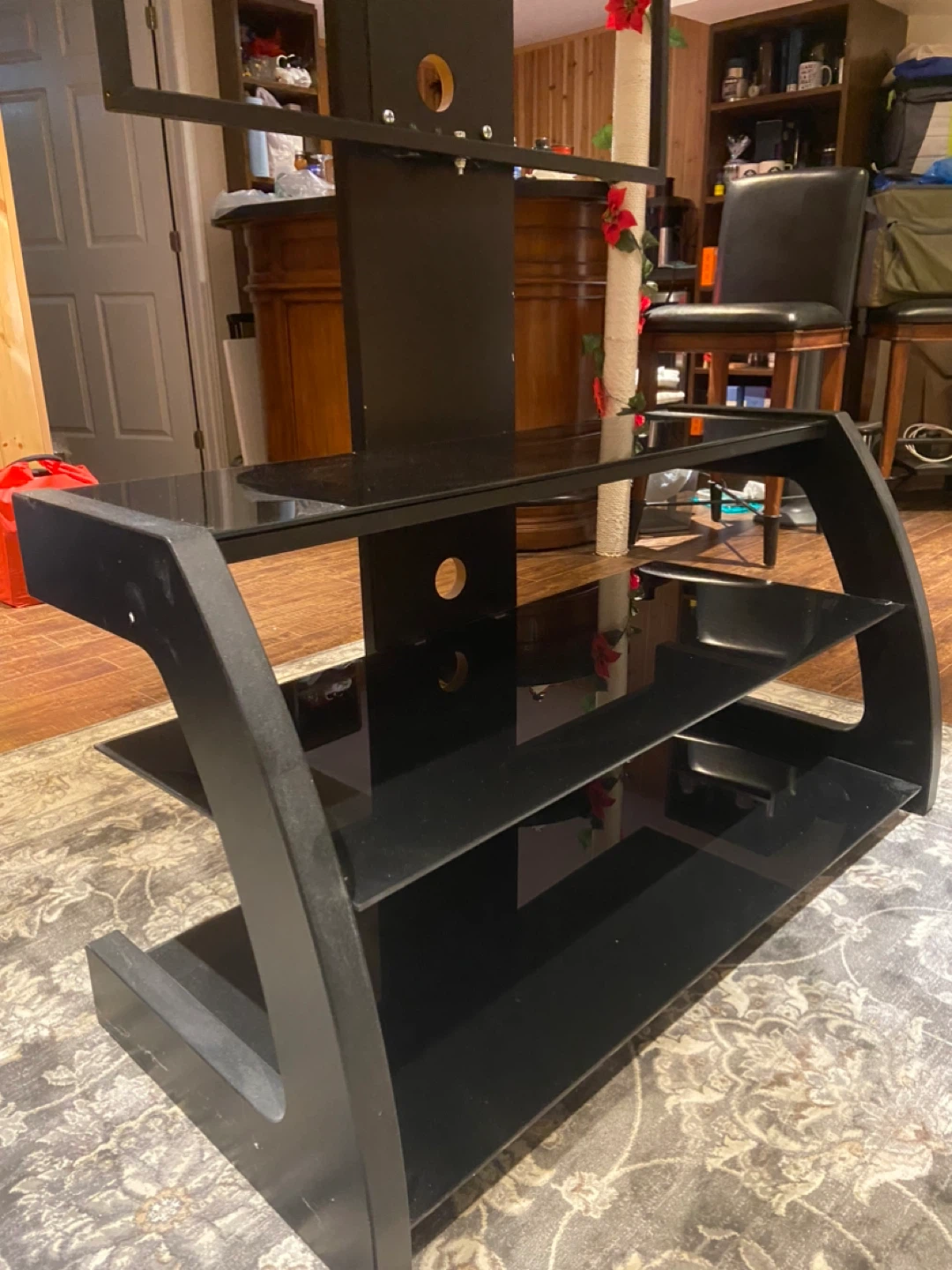 Selling a black TV stand featuring sleek glass shelves. It's in great shape and ready to hold your entertainment system!