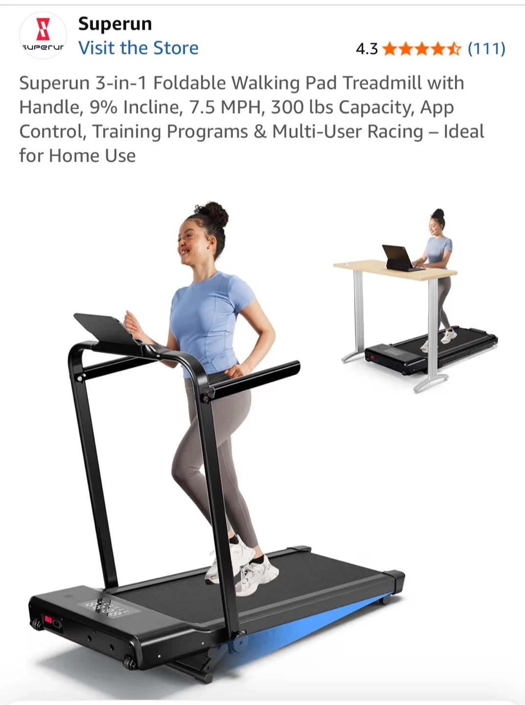 This Superun treadmill is foldable and has a 3-in-1 design. It offers a 9% incline and a top speed of 7.5 MPH. The unit has a 300 lbs weight capacity and supports app control and training programs. It's great for home use! Moving and need to sell.