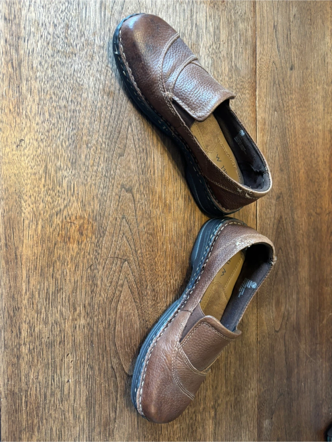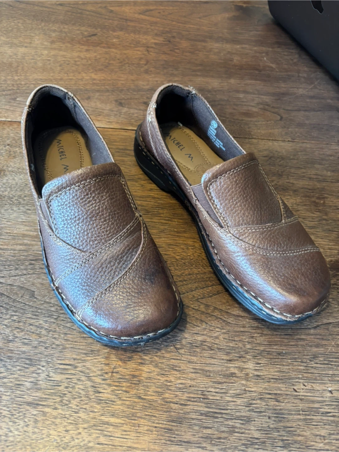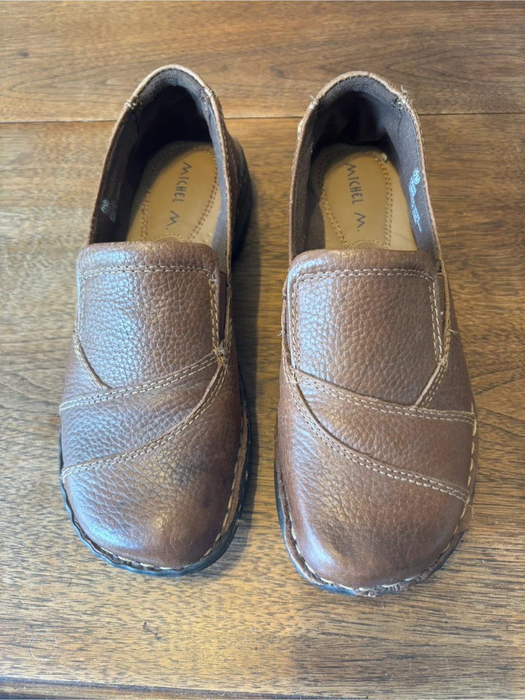 Selling a pair of Michel M. brown leather slip-on shoes! They're in excellent condition and ready for a new home. Perfect for casual wear and easy to slip on and off. Size 7. Cash only.