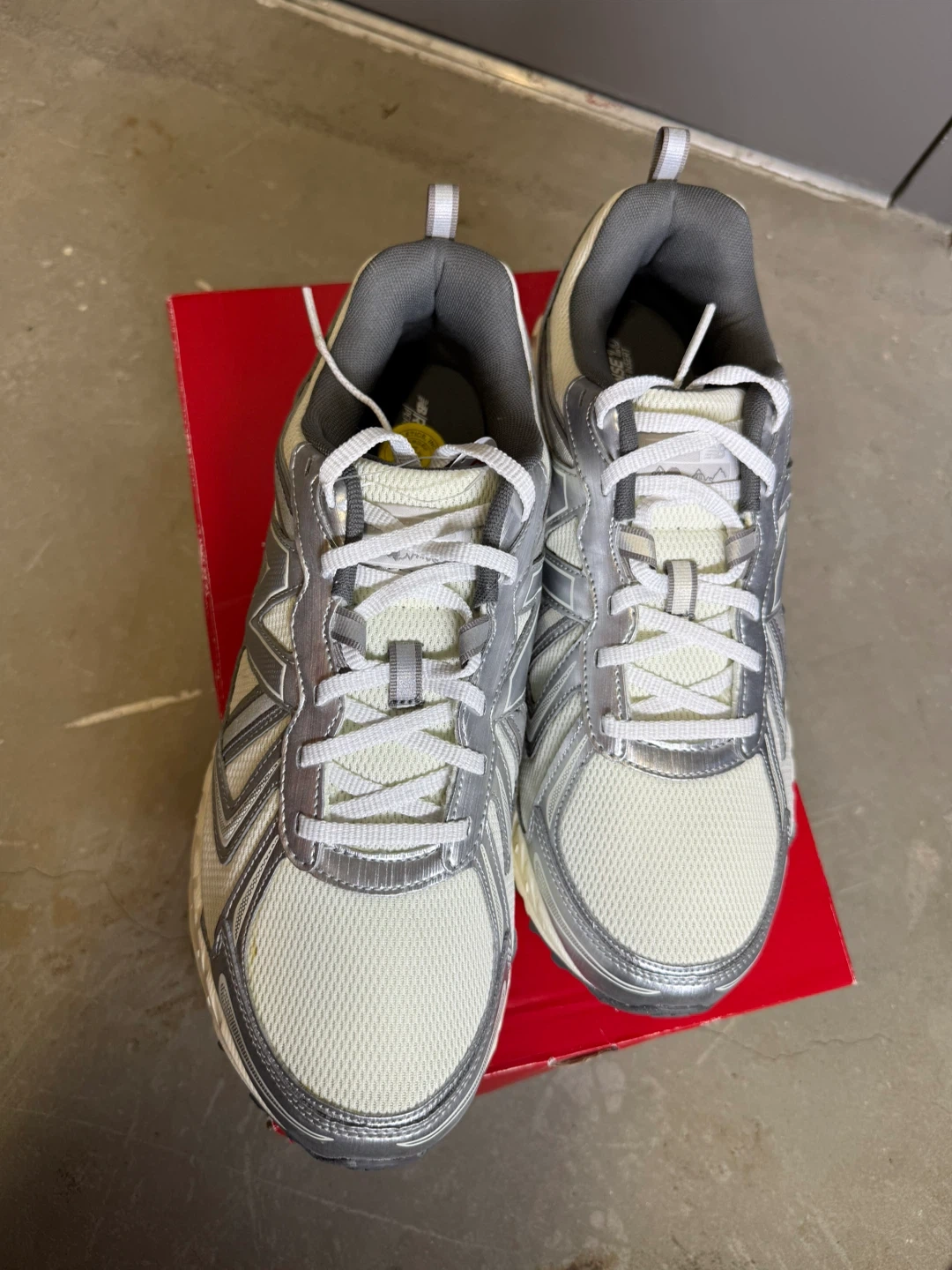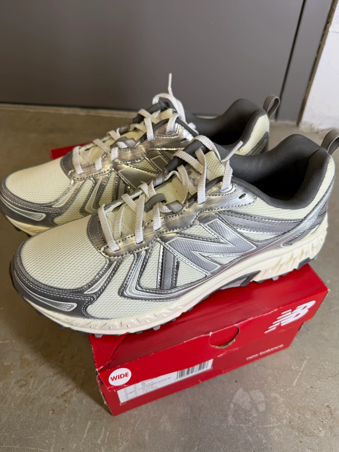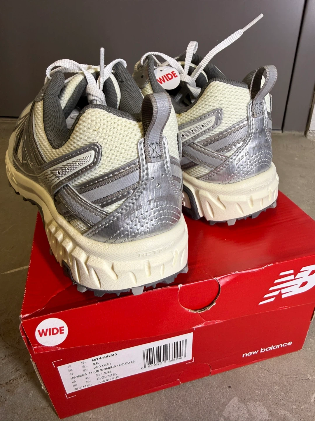New Balance MT410KM5 trail running shoes in a wide width. These shoes are women's size 11. They are a light beige and silver colour. Includes original box.