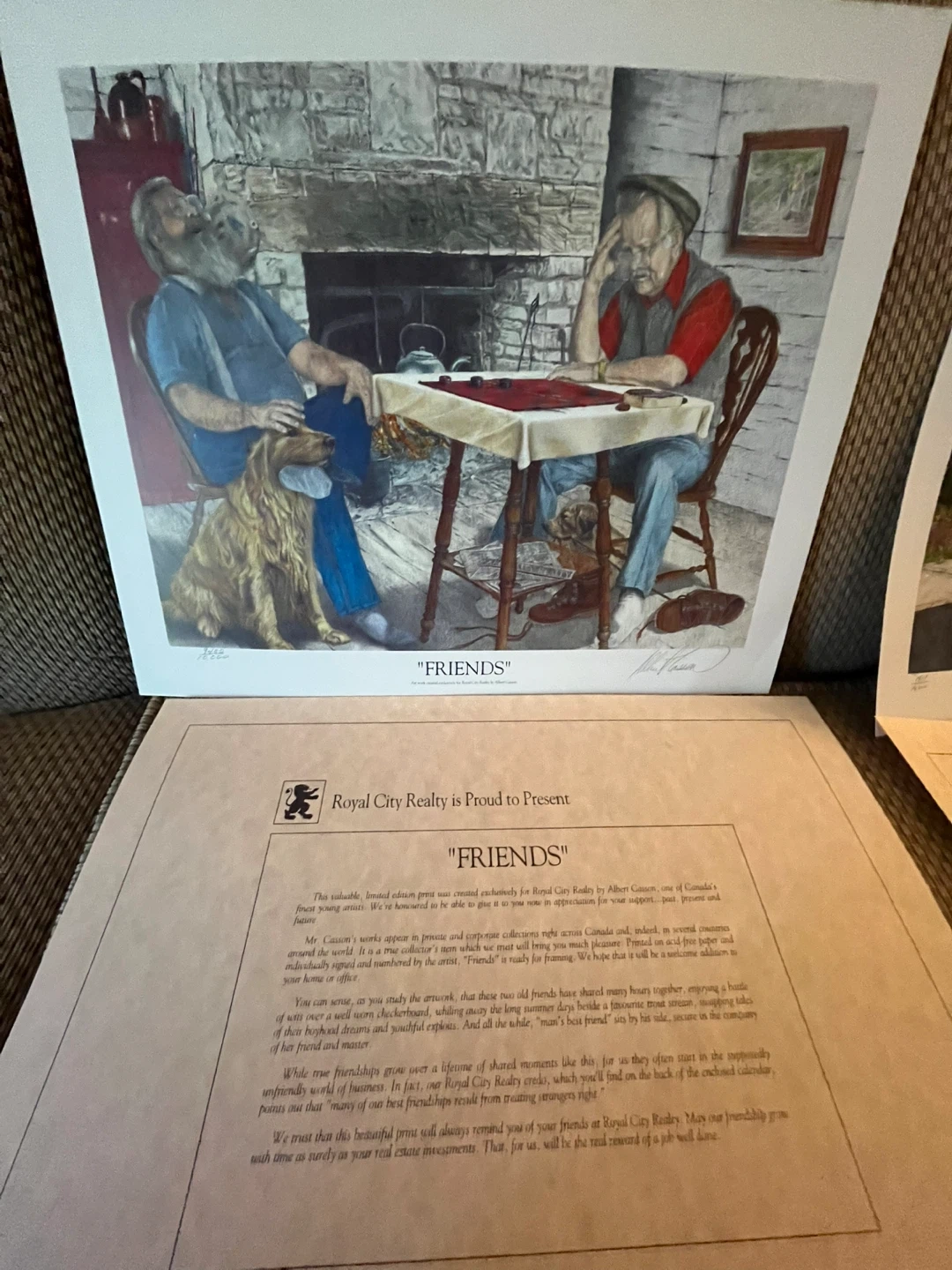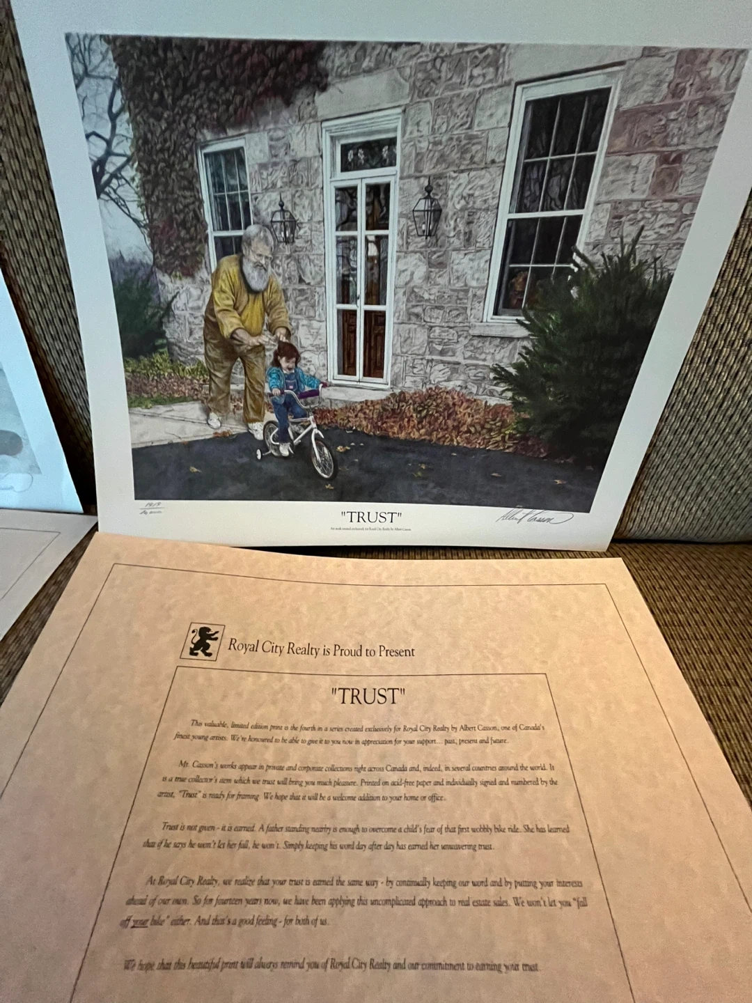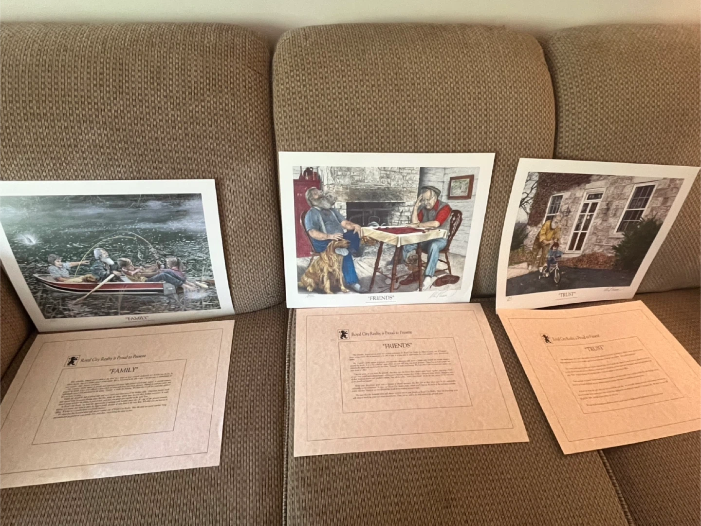 3 limited edition prints by Canadian artist Albert Casson: "Friends", "Trust", and "Family". Each print is from a series created for Royal City Realty. All are signed and numbered by the artist and come with accompanying description sheets. Great condition except for some creasing in the white portion of one corner of “Friends” print (seen in last 2 photos, would not show in a frame)