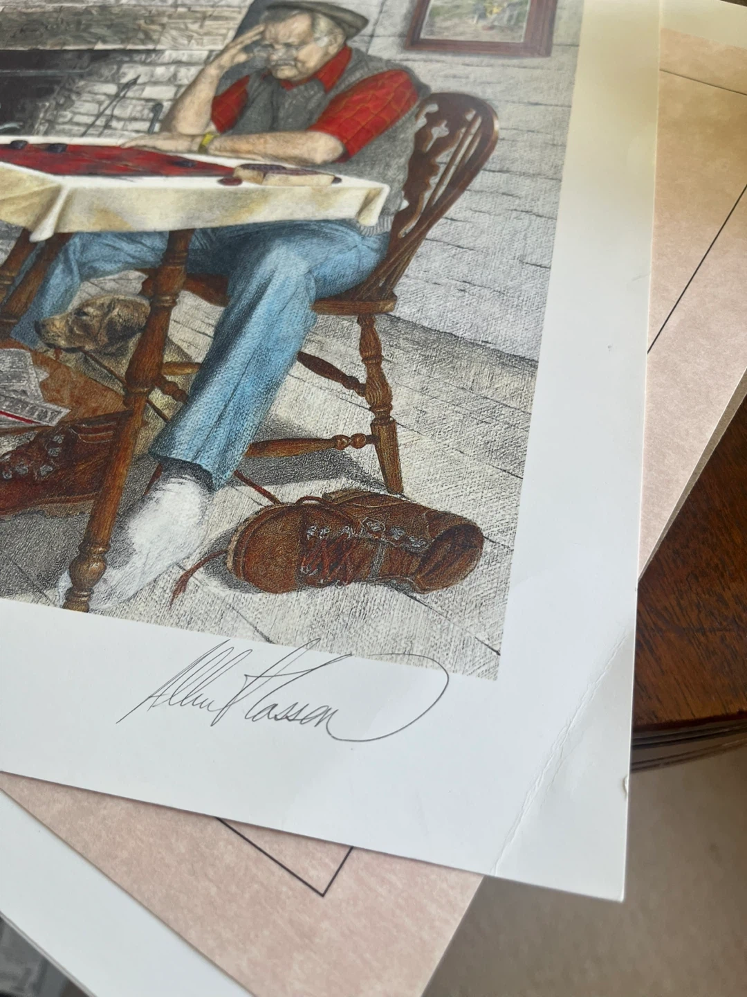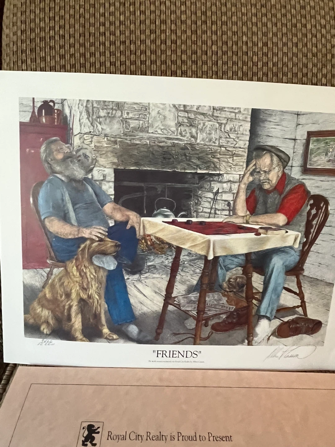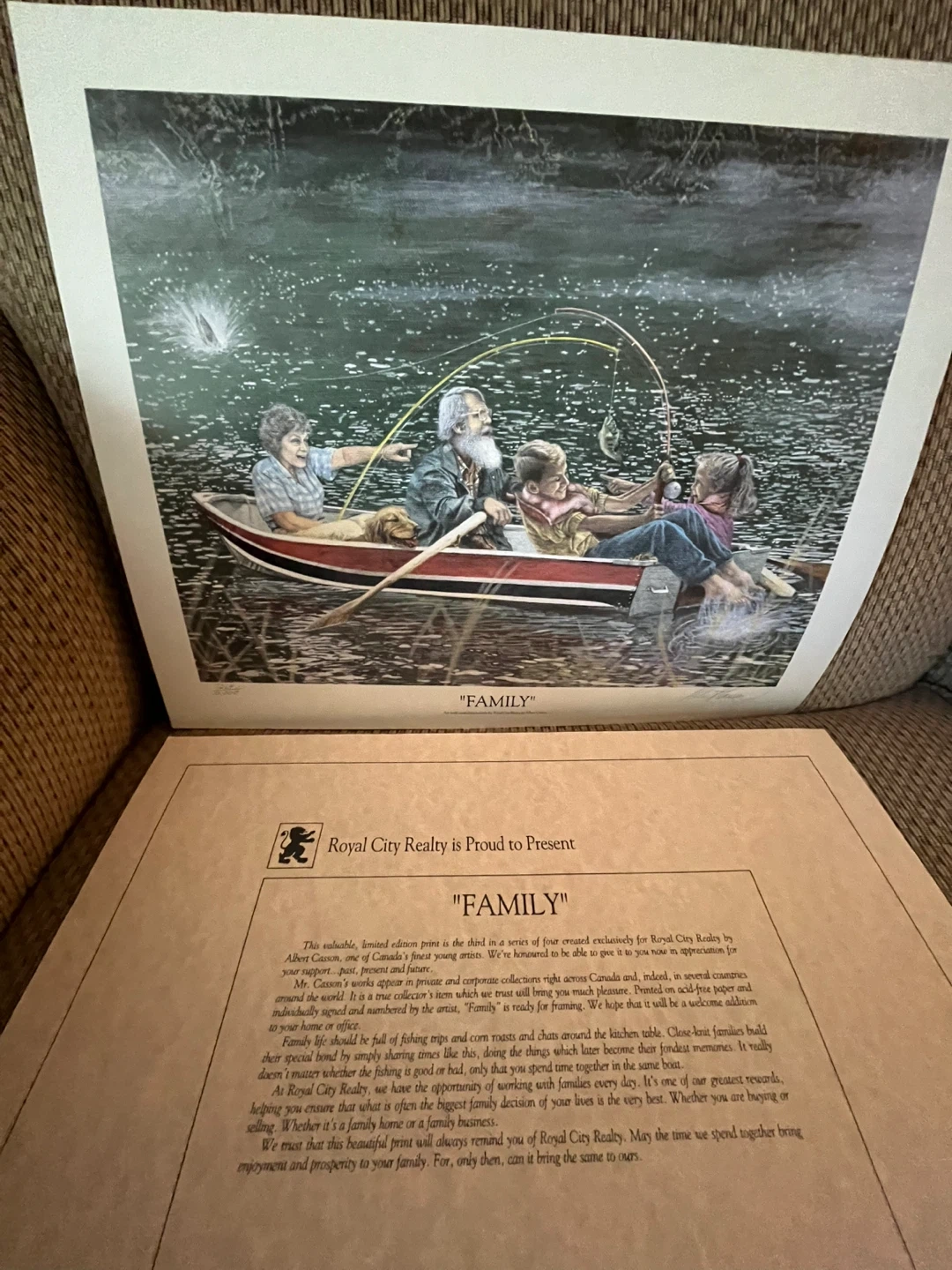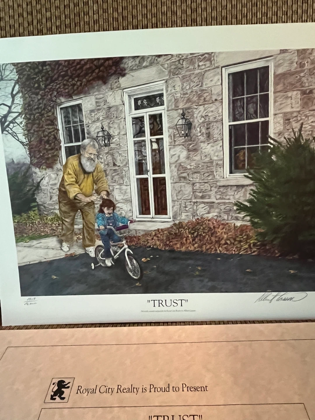 3 limited edition prints by Canadian artist Albert Casson: "Friends", "Trust", and "Family". Each print is from a series created for Royal City Realty. All are signed and numbered by the artist and come with accompanying description sheets. Great condition except for some creasing in the white portion of one corner of “Friends” print (seen in last 2 photos, would not show in a frame)