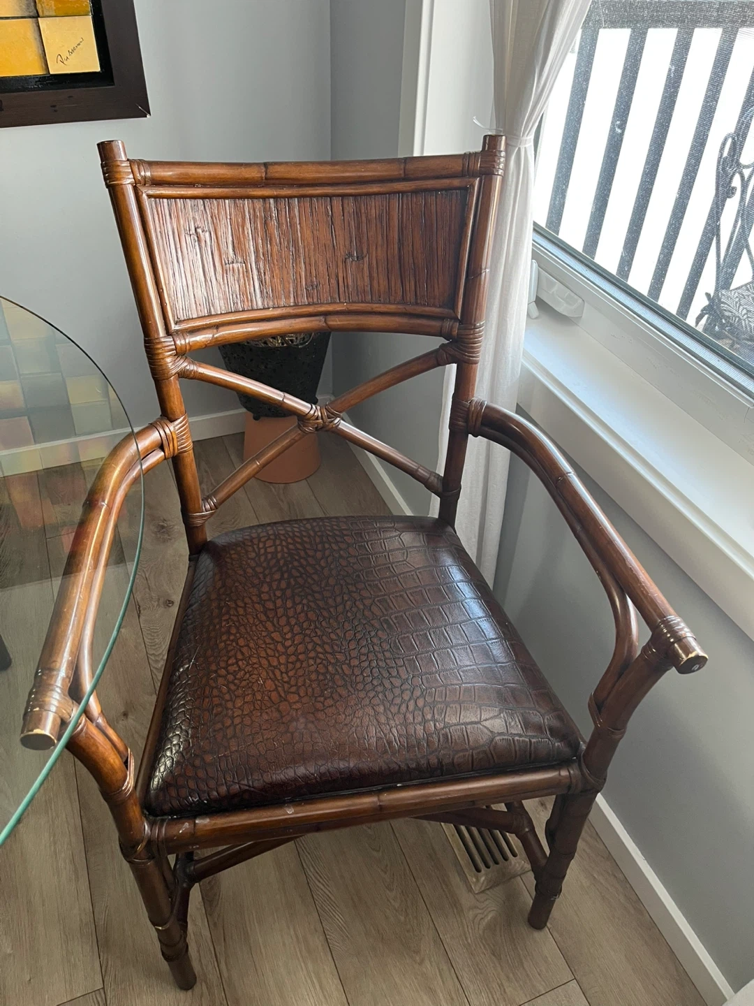 Dining set with a round glass top table and four rattan chairs. The chairs have a dark brown, textured faux leather seat. This set's natural materials add a touch of tropical flair to any dining space. It's perfect for smaller dining areas or breakfast nooks.