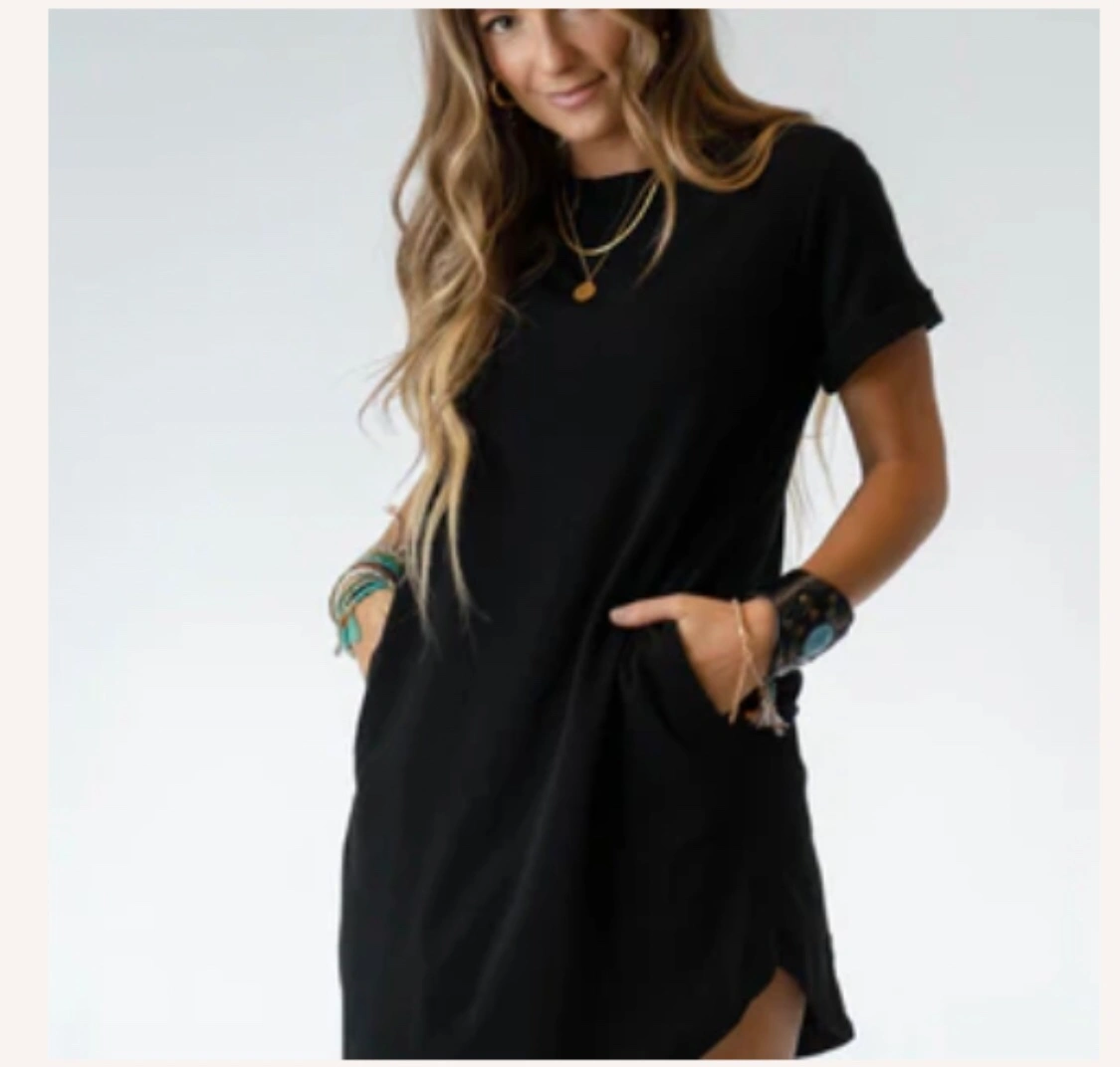 Short sleeve, relaxed fit, mini length dress with pockets. Lightweight and comfortable. Perfect for everyday wear. Great for layering. Can be worn with sneakers, sandals or boots.