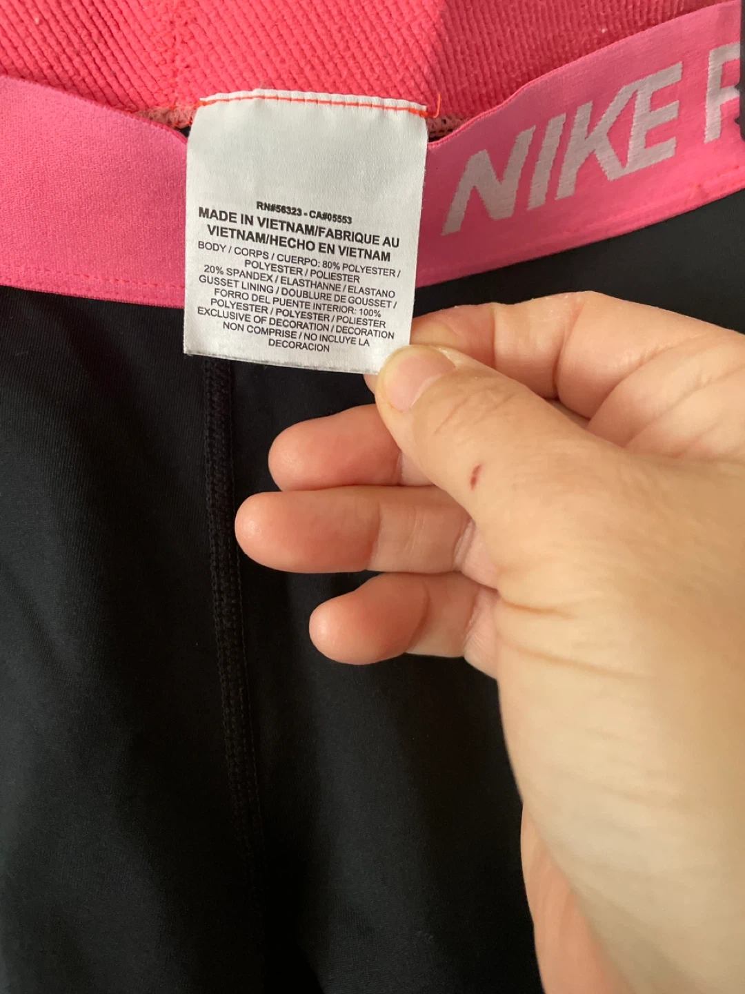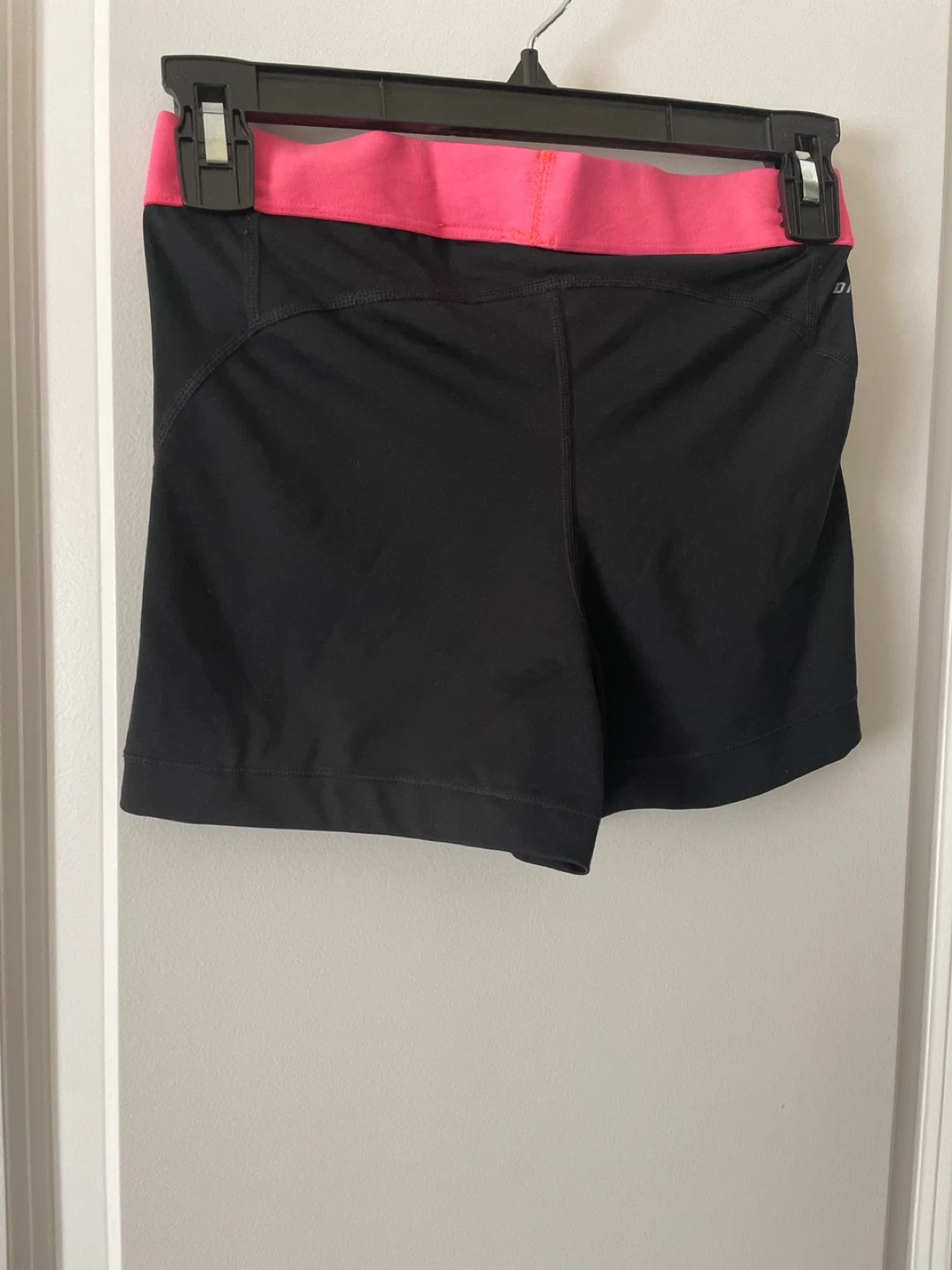 Selling a pair of Nike Pro women's shorts in size medium. They're black with a pink waistband and feature the Nike logo. Made with 80% polyester and 20% spandex, these shorts are great for workouts or everyday wear!