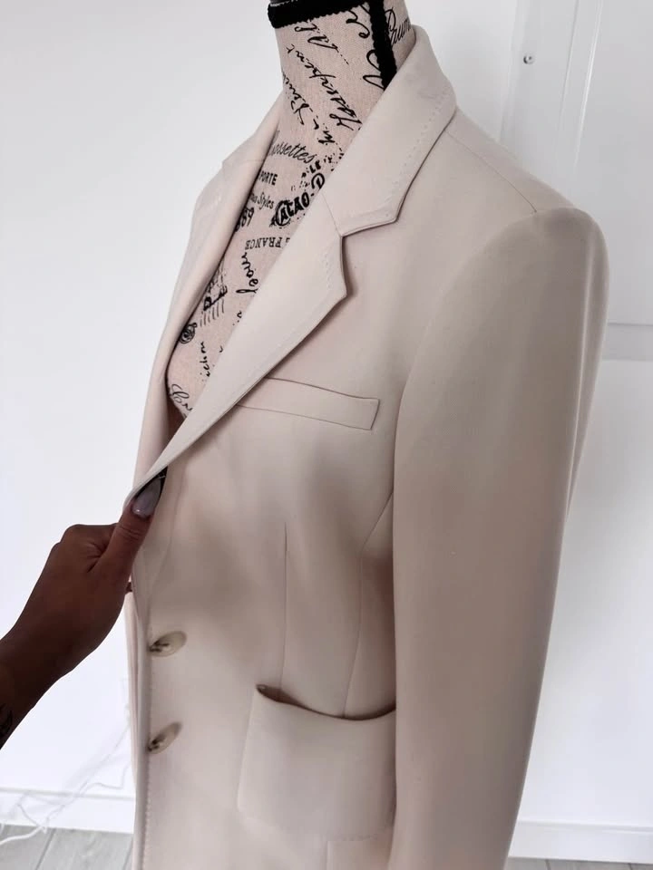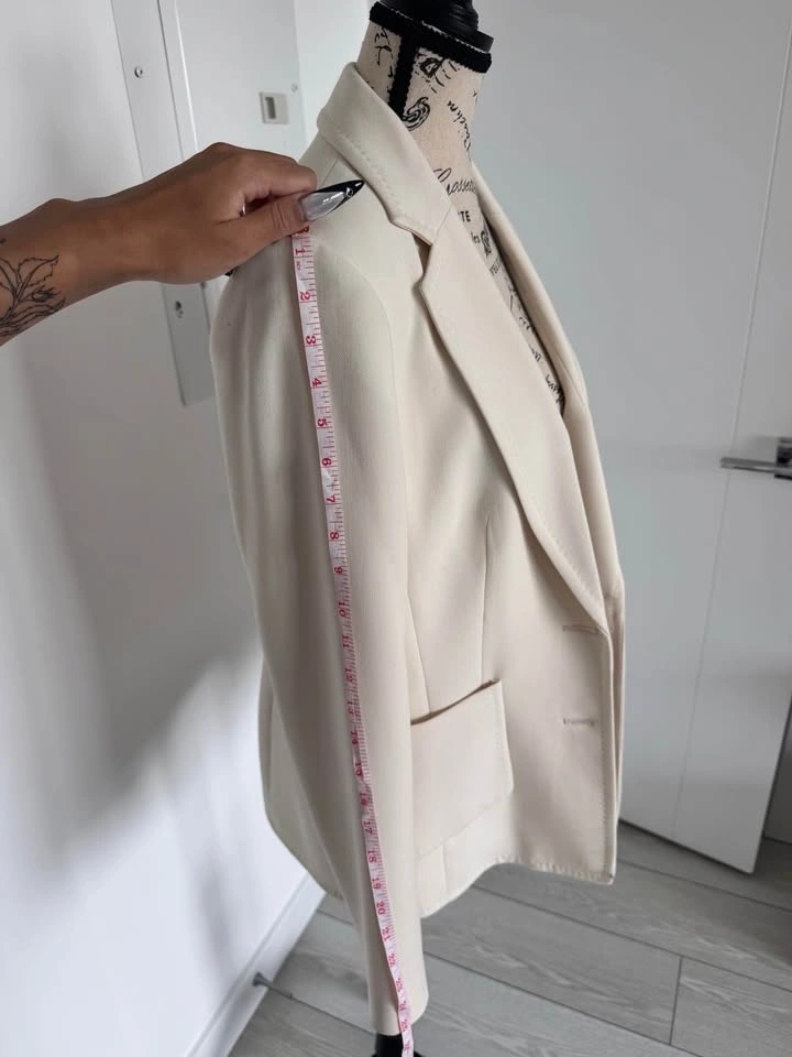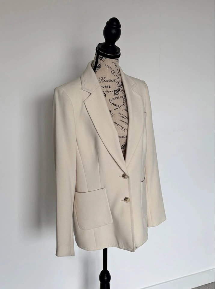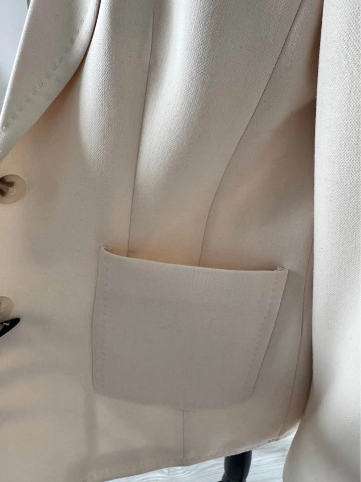 Cream color, size 8. Has two-button closure with two front flap pockets. Shoulder to shoulder measures about 15.5 inches. Sleeve length from shoulder about 23.5 inches. Length from shoulder to hem about 26.5 inches. Great for work or dressing up any outfit. Pickup in Cougar Ridge.