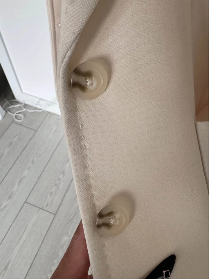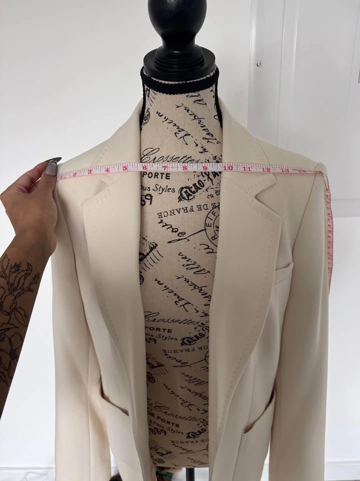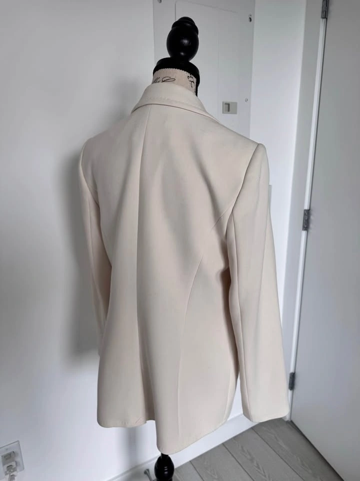 Cream color, size 8. Has two-button closure with two front flap pockets. Shoulder to shoulder measures about 15.5 inches. Sleeve length from shoulder about 23.5 inches. Length from shoulder to hem about 26.5 inches. Great for work or dressing up any outfit. Pickup in Cougar Ridge.