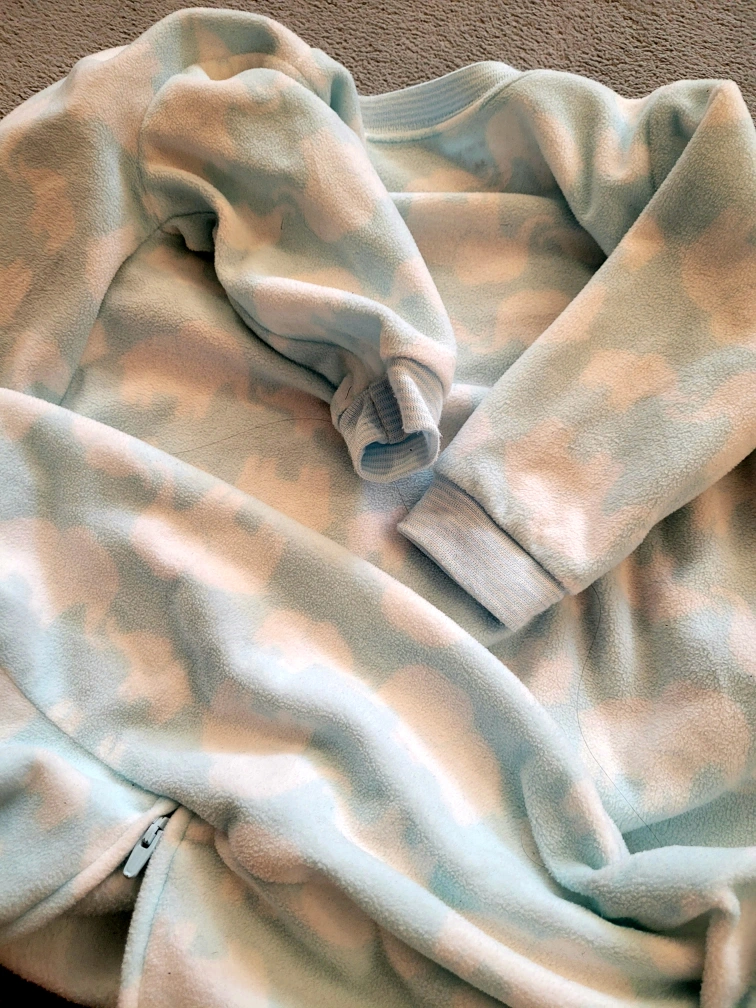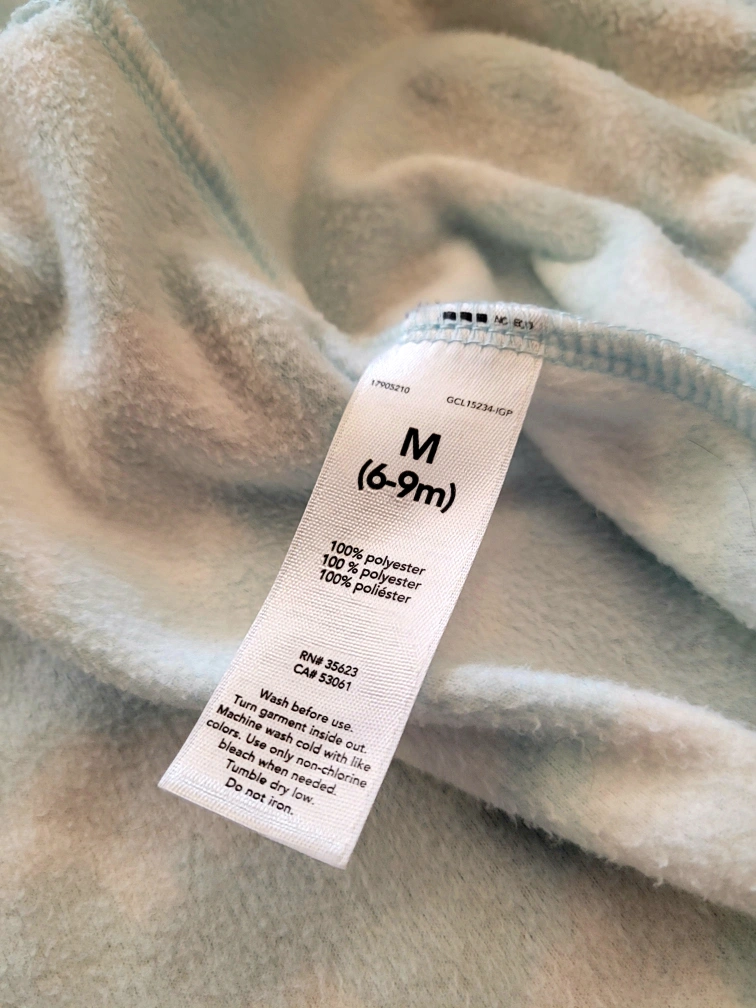 Blue and white fleece sleep sack. Zipper closure. Long sleeves. Size M (6-9 months).