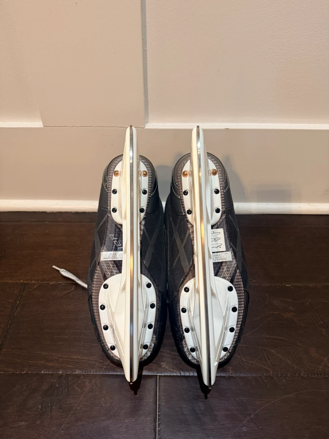 New Bauer hockey skates. These skates feature TUUK holders and stainless steel blades. Size 9 US 10.5 is clearly marked on the tongue and box.