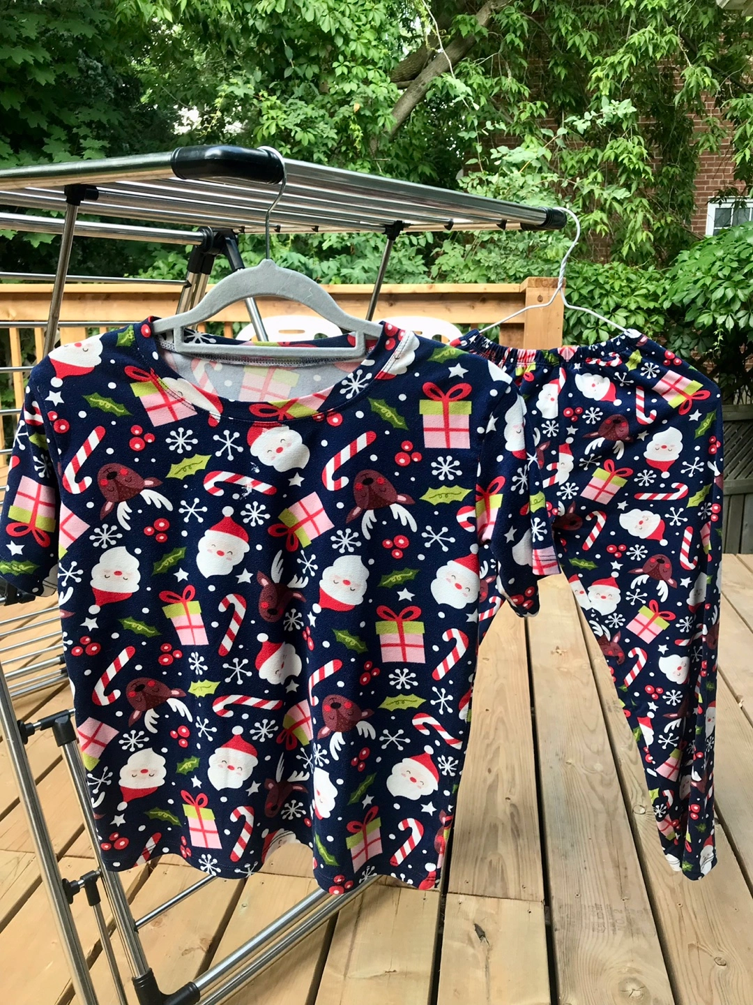 Here's a cute Christmas pajama set! It features a fun, festive pattern with Santa, reindeer, candy canes, and gifts on a navy blue background. Perfect for getting into the holiday spirit!