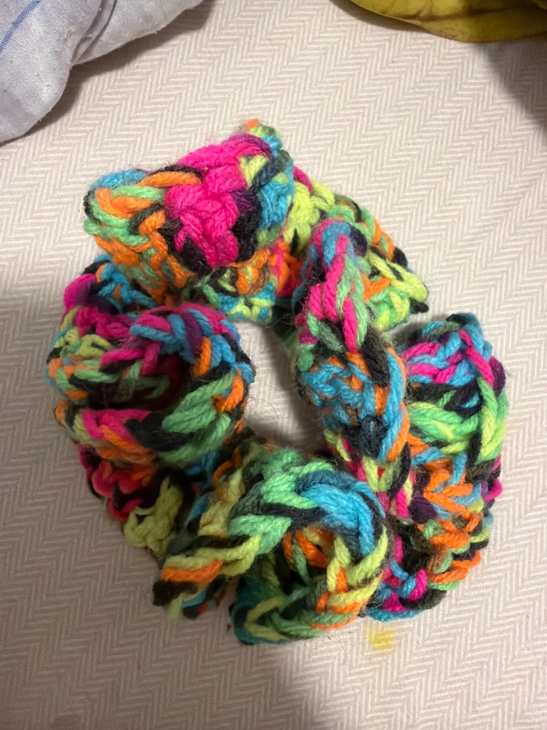A colourful scrunchie made with chunky yarn. It features a vibrant mix of pink, orange, green, and blue. Great for adding a pop of colour to any hairstyle!