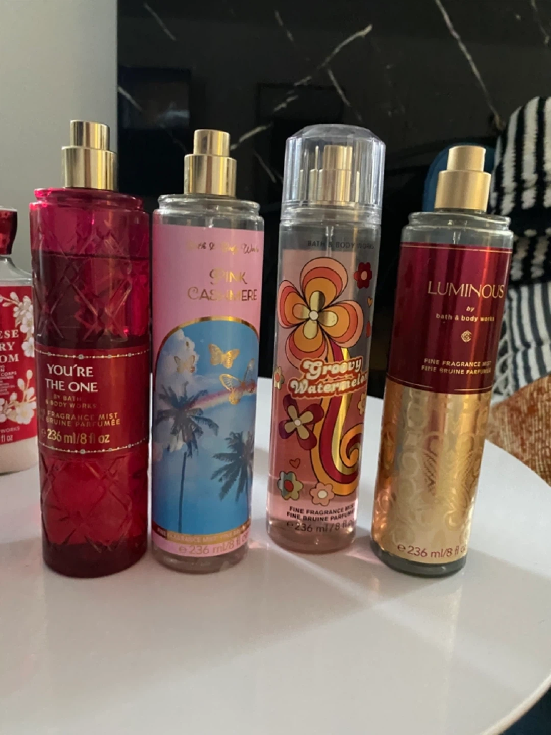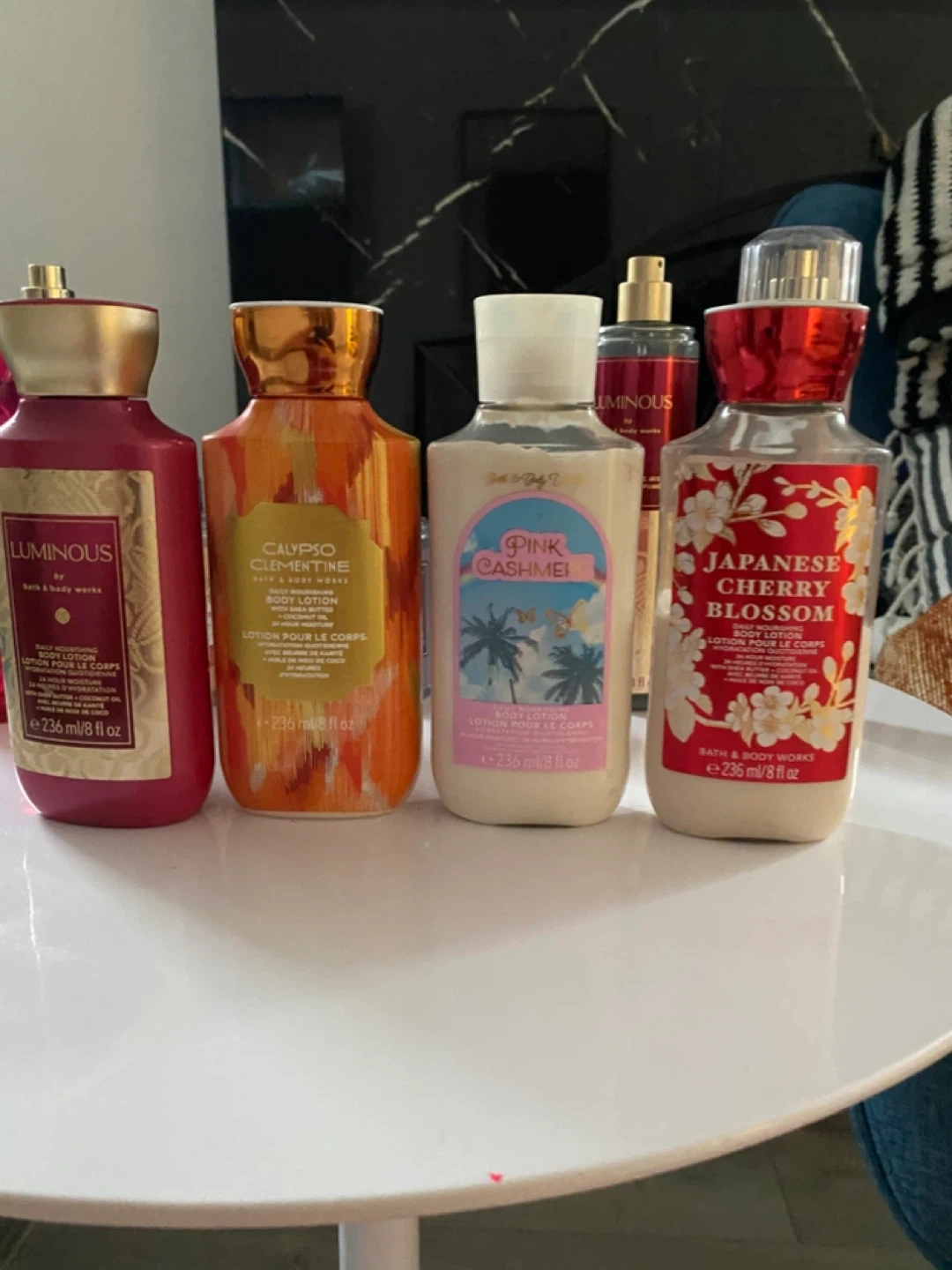 A collection of Bath & Body Works lotions and body mists. Includes Japanese Cherry Blossom, Luminous, Pink Cashmere, and more. All bottles are 8 fl oz or 75 ml. Great for everyday use! Some of them are used but a couple are not touched.