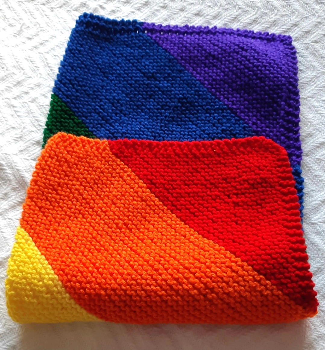 Handmade baby blanket in rainbow colours, measures 24" x 24". Perfect for stroller and car seat. Acrylic yarn.