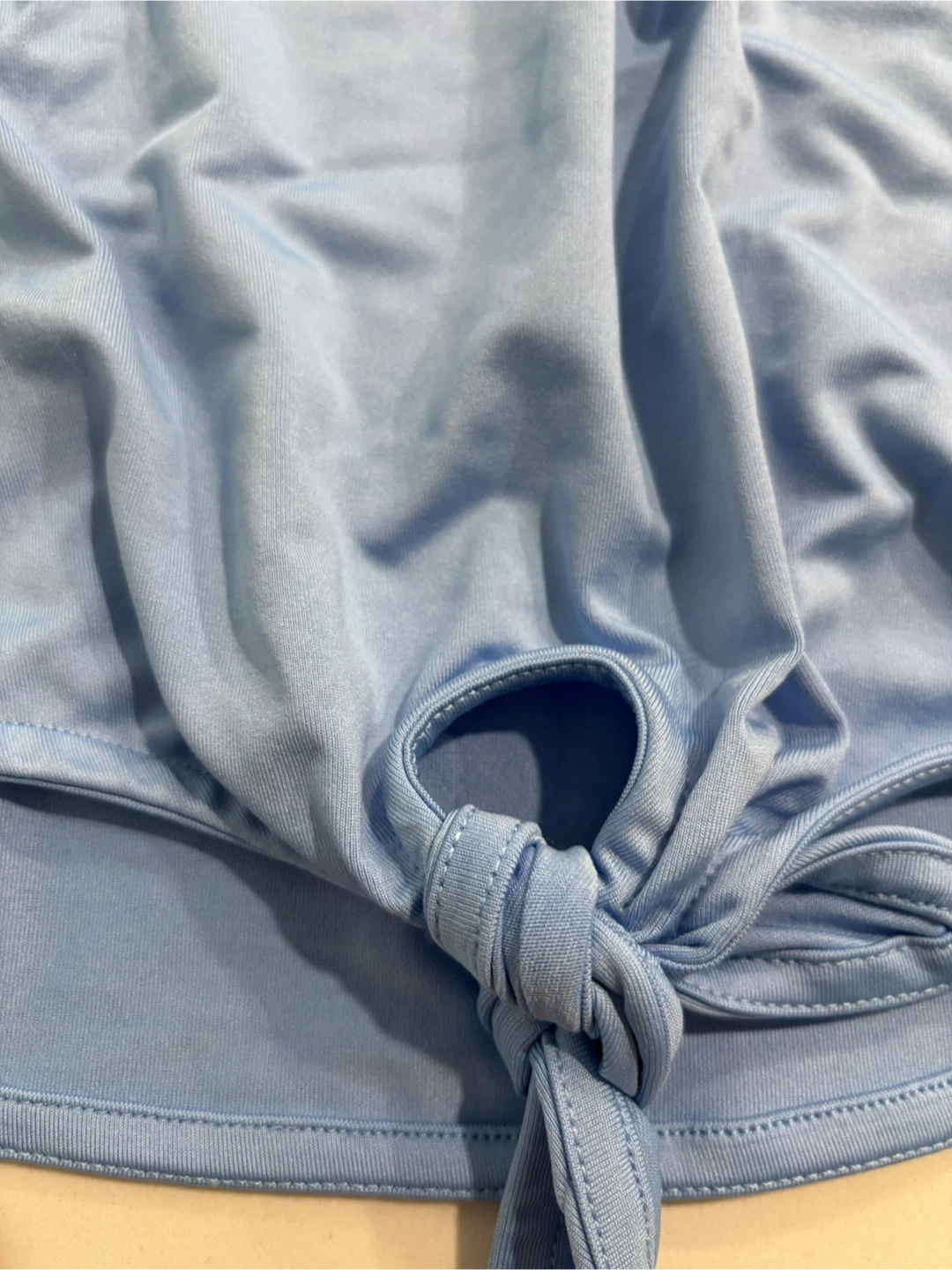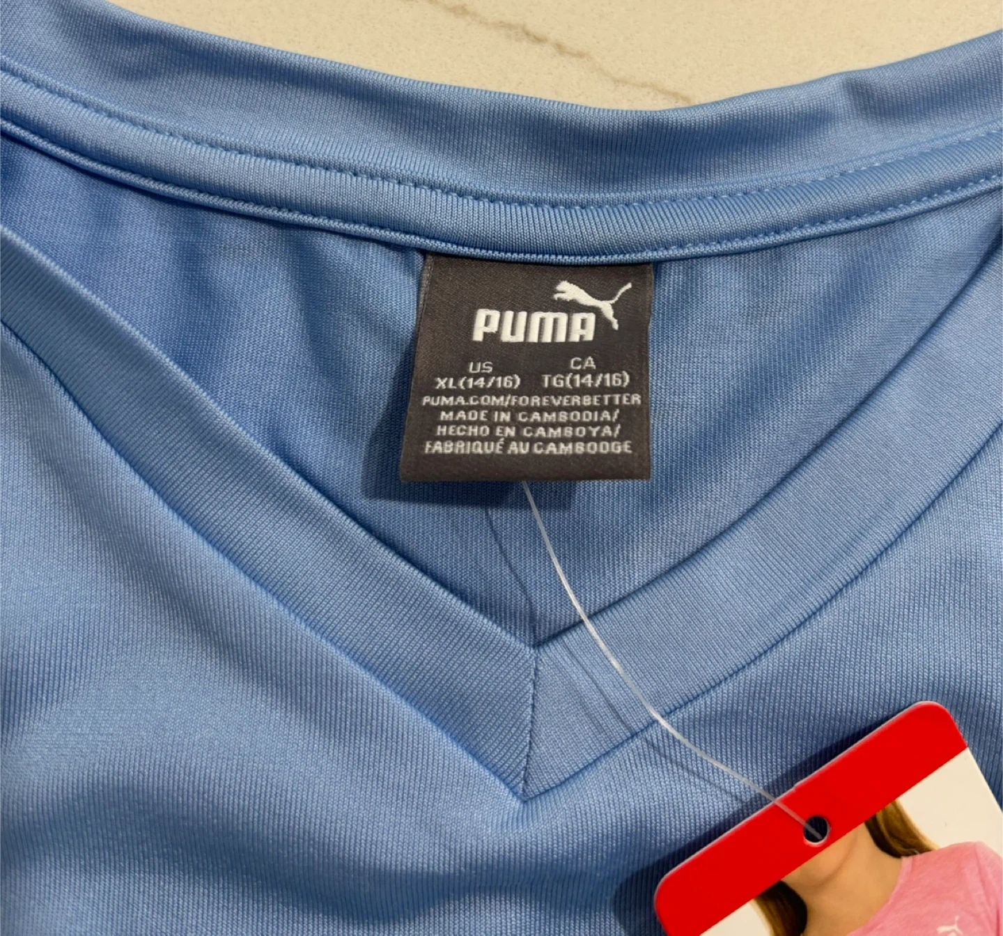 This is a new Puma t-shirt in light blue. It's a size XL/TG (14/16) with a colourful Puma logo graphic. The shirt has a v-neck and a tie knot at the bottom. It's made of polyester blend material. W