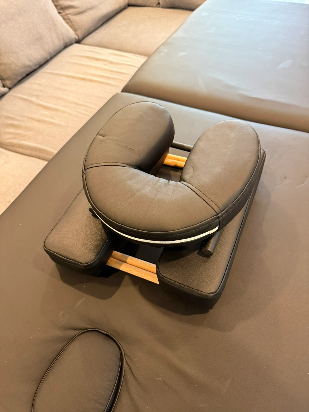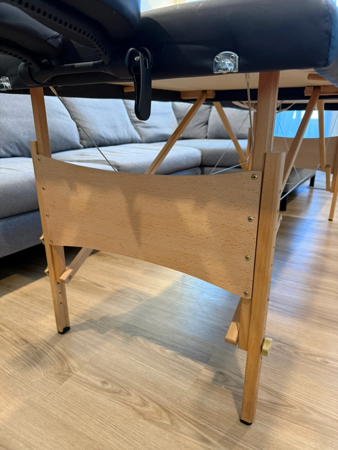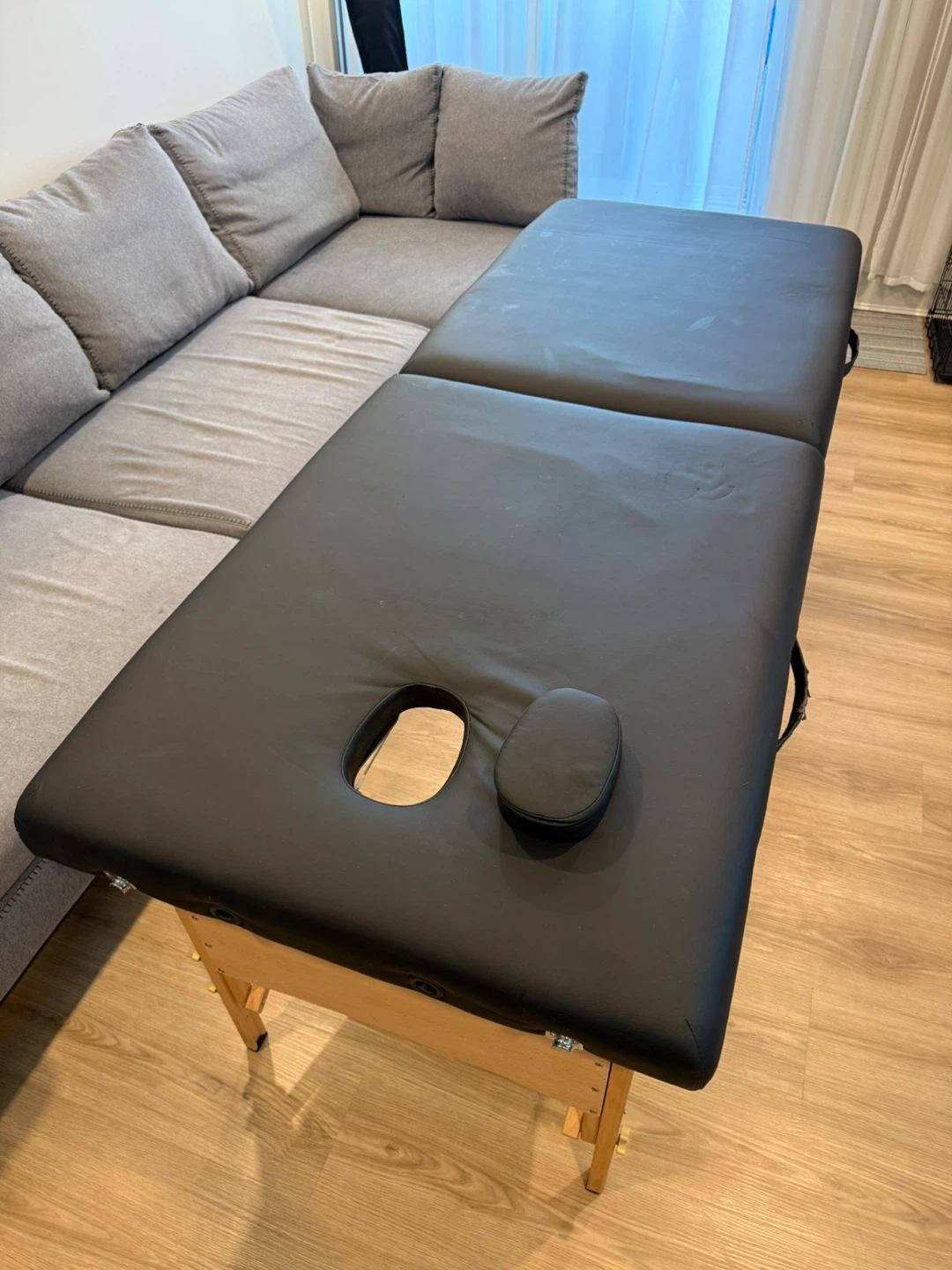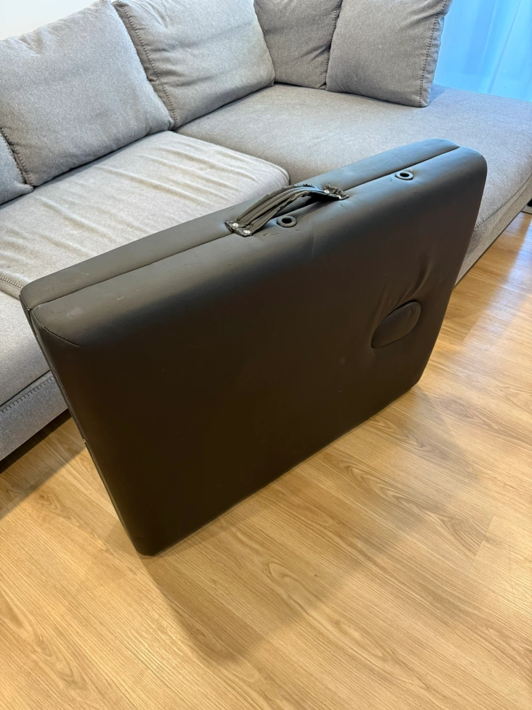 Black vinyl massage table with wooden frame. It includes an adjustable face cradle and arm rests for added comfort. Minor wear on the side, as shown in the photo.