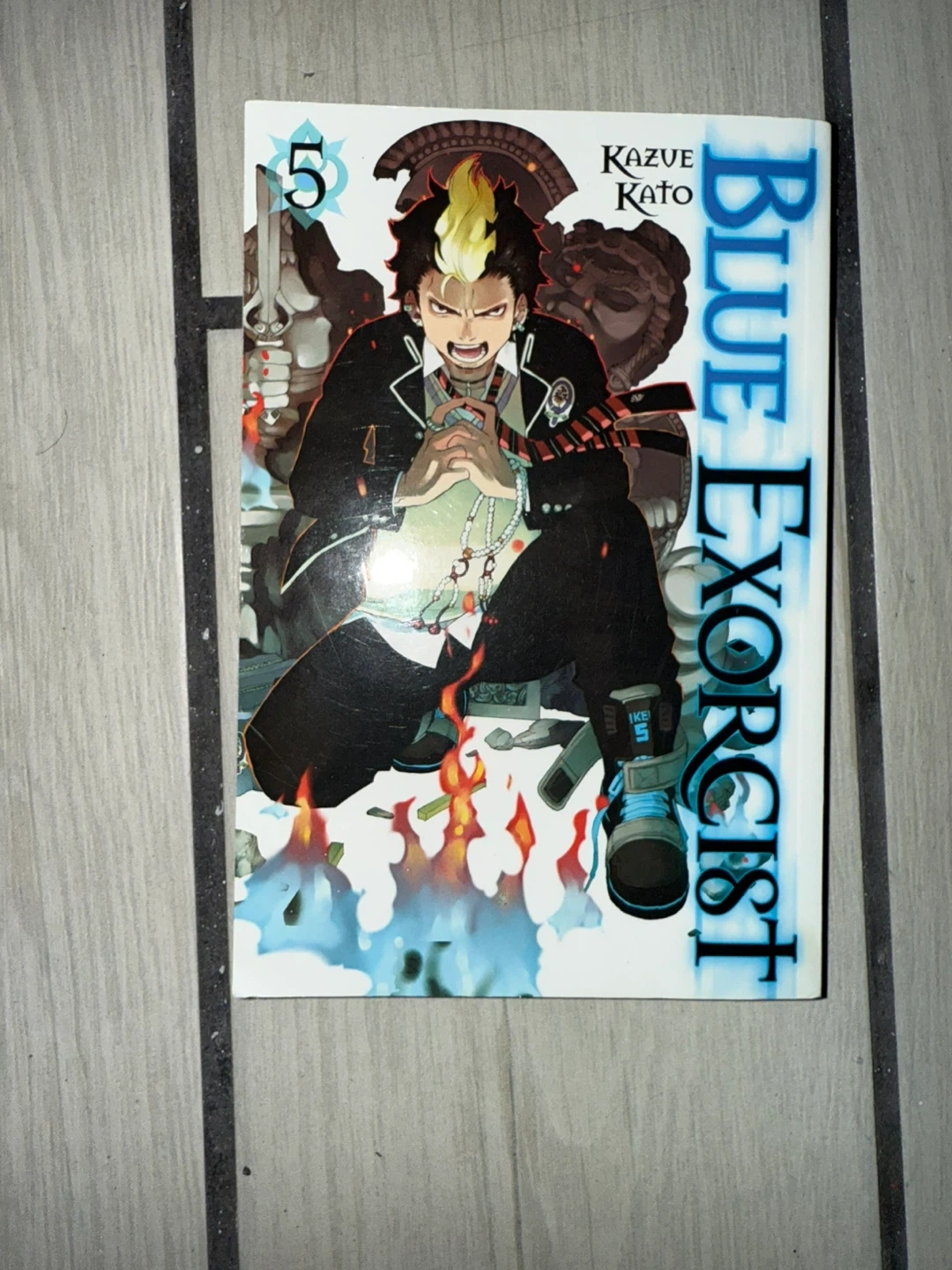 This is volume 5 of the Blue Exorcist manga series by Kazue Kato. It's an exciting adventure with Rin Okumura fighting demons. The book is in good condition.