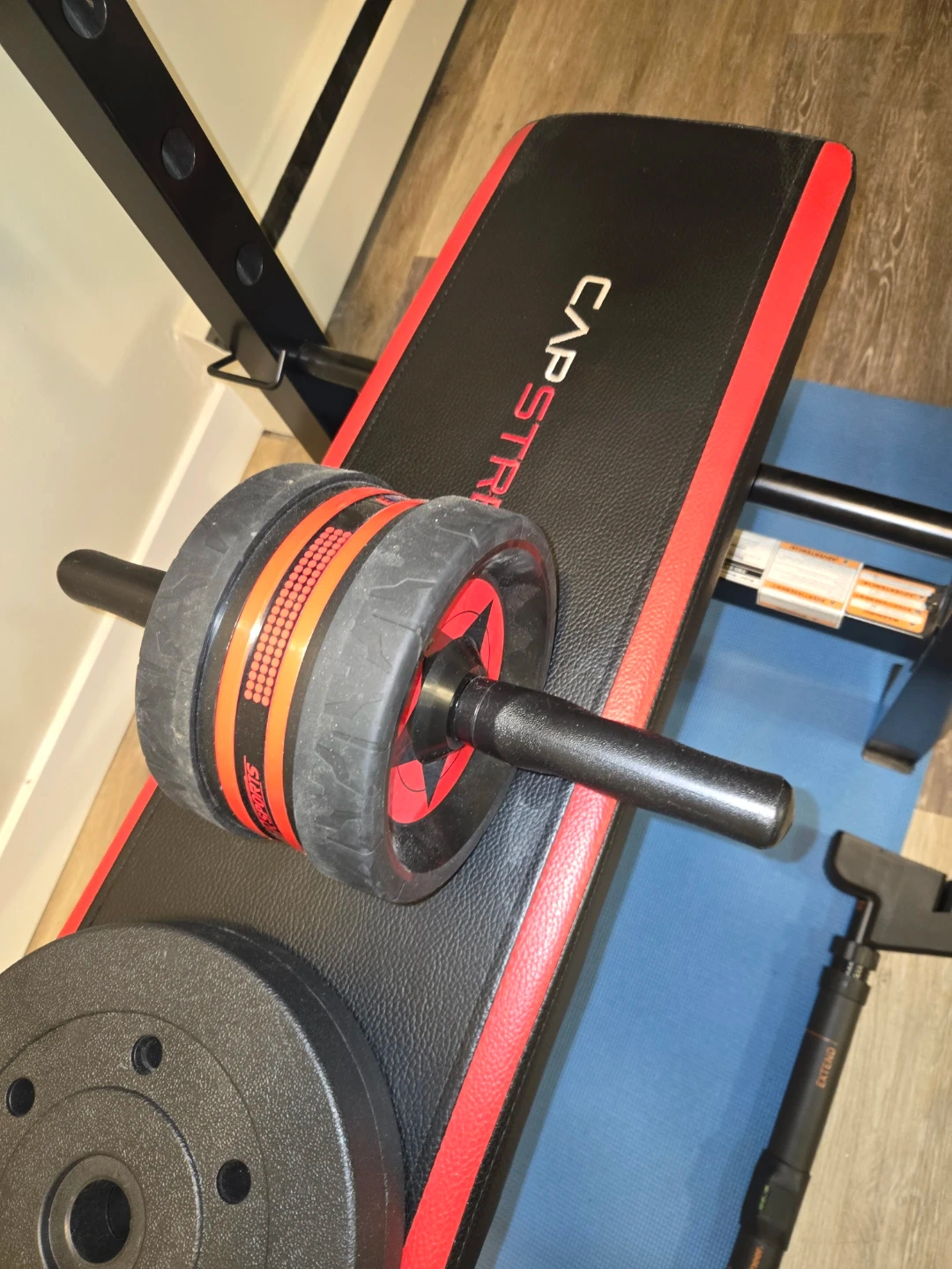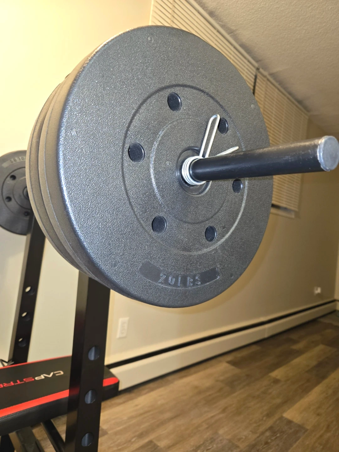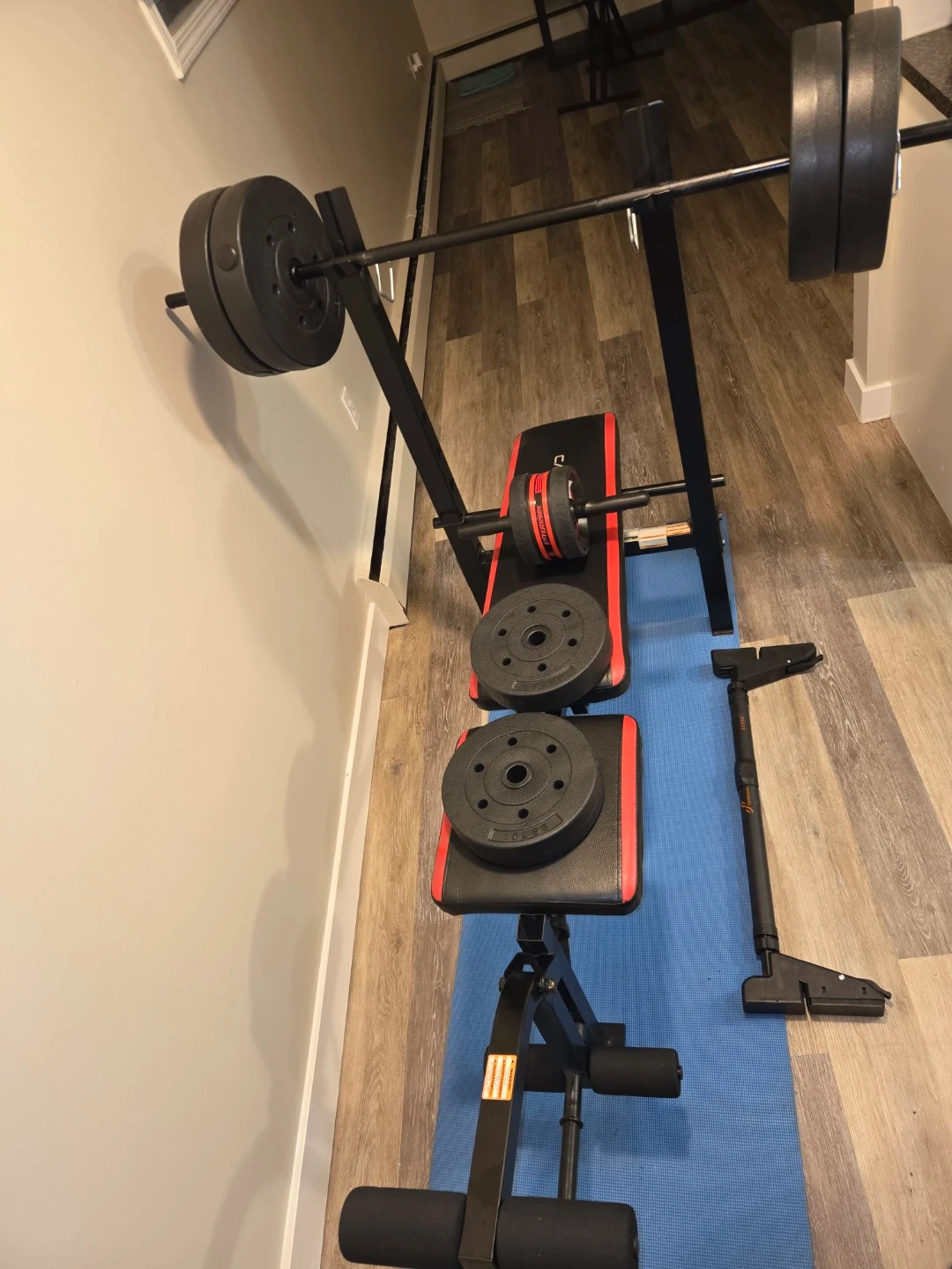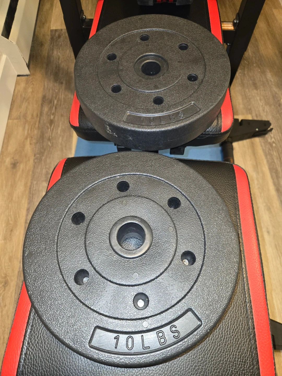This CAP Barbell weight bench comes with a barbell and various weight plates. The bench itself has a red and black upholstered seat. Includes a total of four 10 lb weight plates and two 20 lb weight plates. A separate attachment labelled 'SportsArt EXTEND' is also included. Great for home workouts!