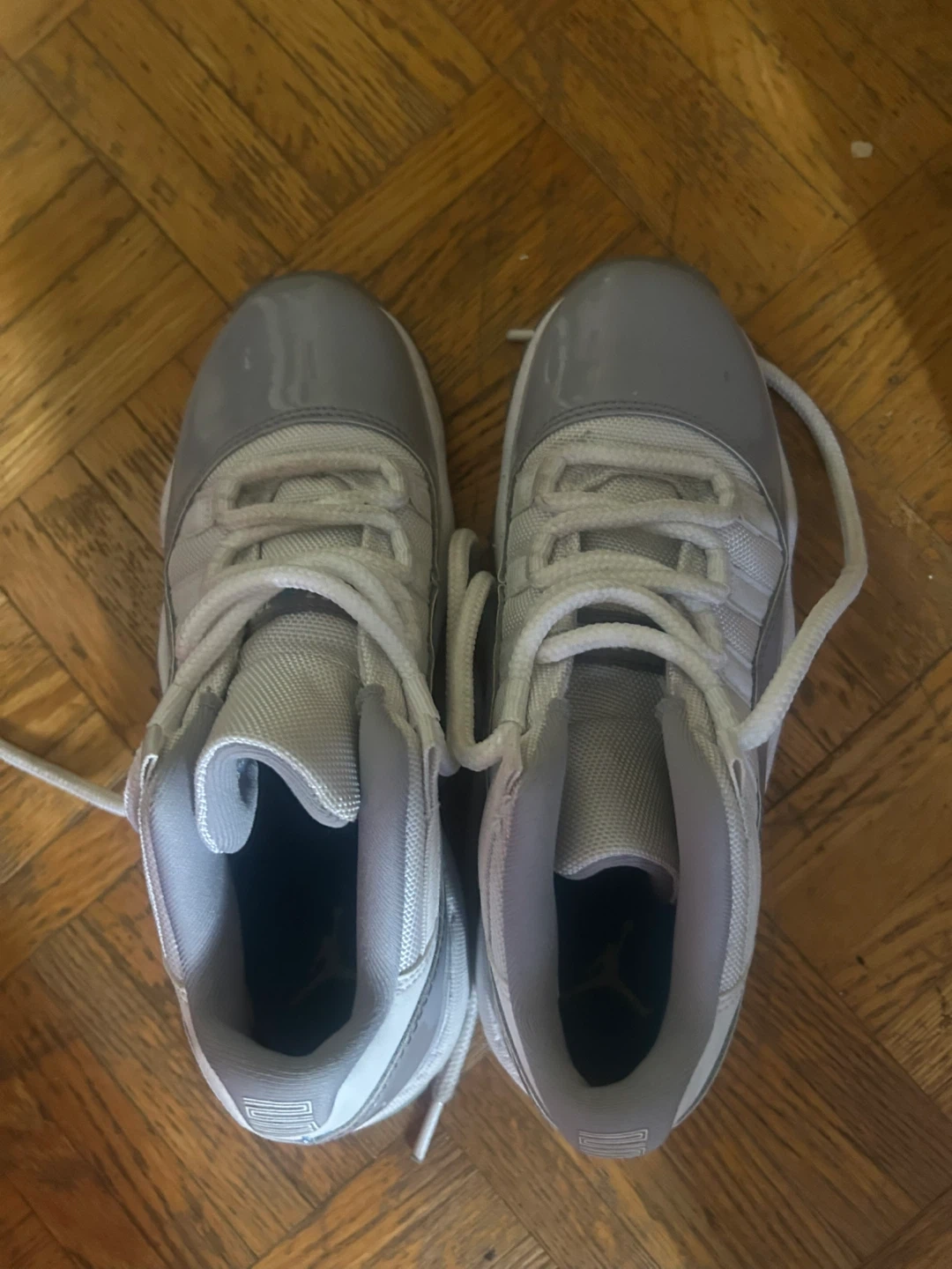 These Air Jordan 11 sneakers are in the popular "Cool Grey" colourway. They feature a patent leather mudguard and a translucent outsole. A checkered pattern is visible under the heel on the sole. Size 4 youth!