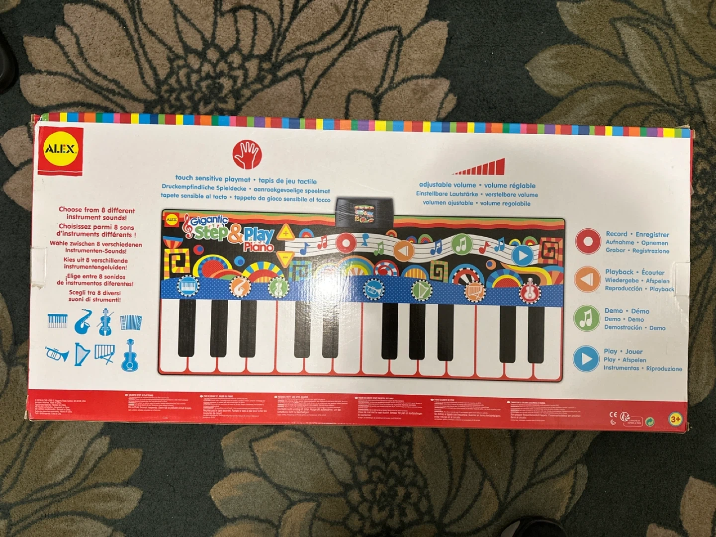 This ALEX Gigantic Step & Play Piano mat lets kids make music with their feet. It measures 180.3 cm x 73.6 cm (71 in x 29 in) and offers 8 different instrument sounds. It's great for active musical play!