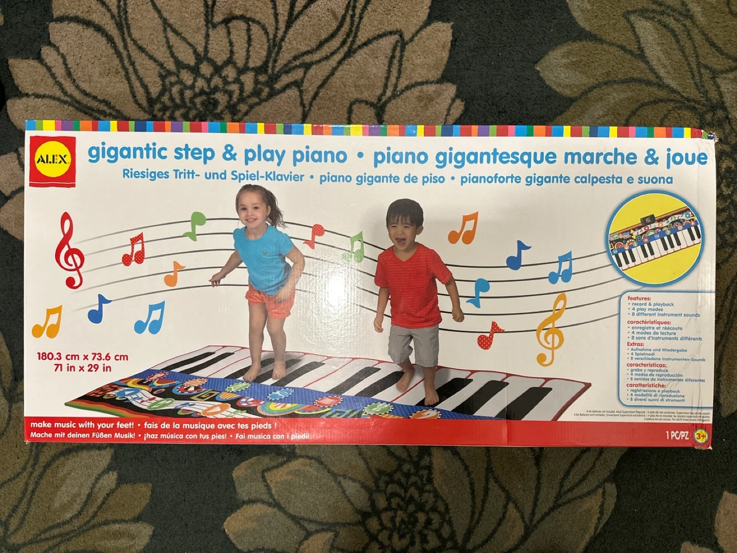 This ALEX Gigantic Step & Play Piano mat lets kids make music with their feet. It measures 180.3 cm x 73.6 cm (71 in x 29 in) and offers 8 different instrument sounds. It's great for active musical play!