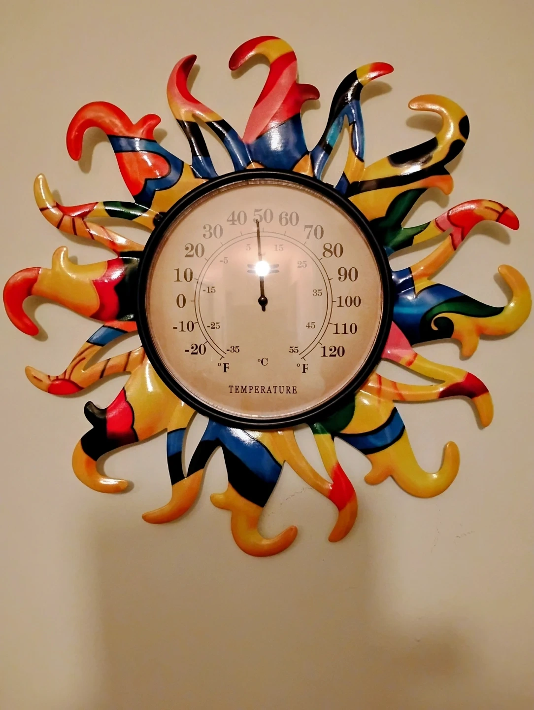 This decorative sun thermometer displays the temperature in both Celsius and Fahrenheit. It's a colourful addition to any room, indoor or outdoor. Measures from -20°C to 55°C and -4°F to 131°F.