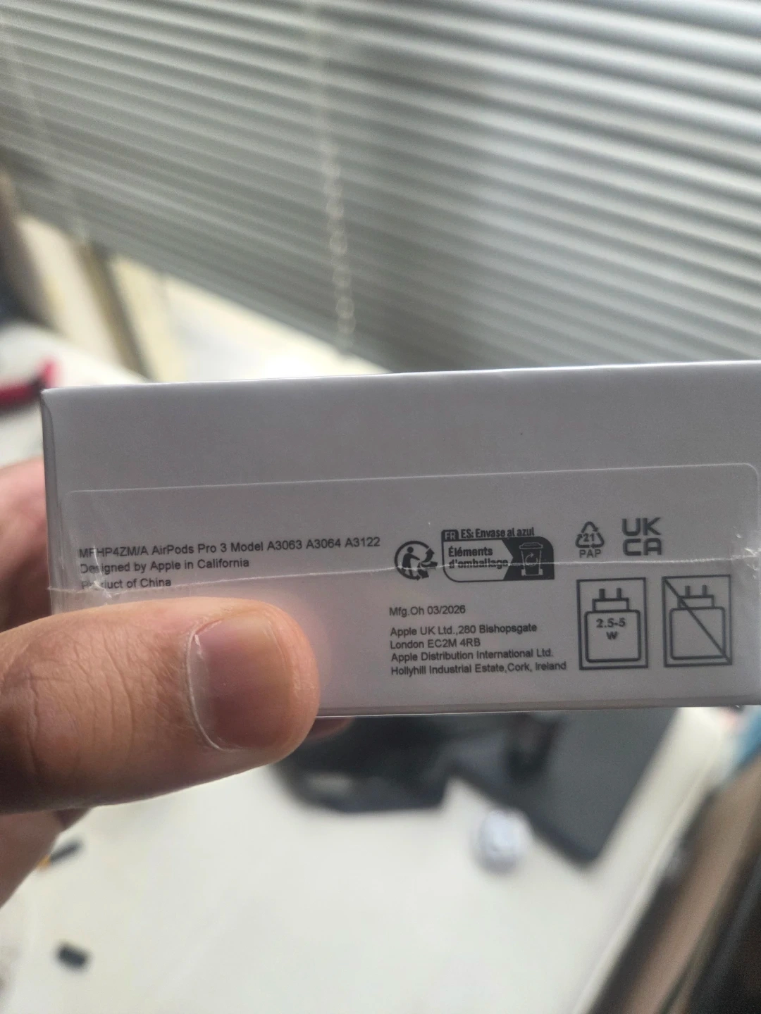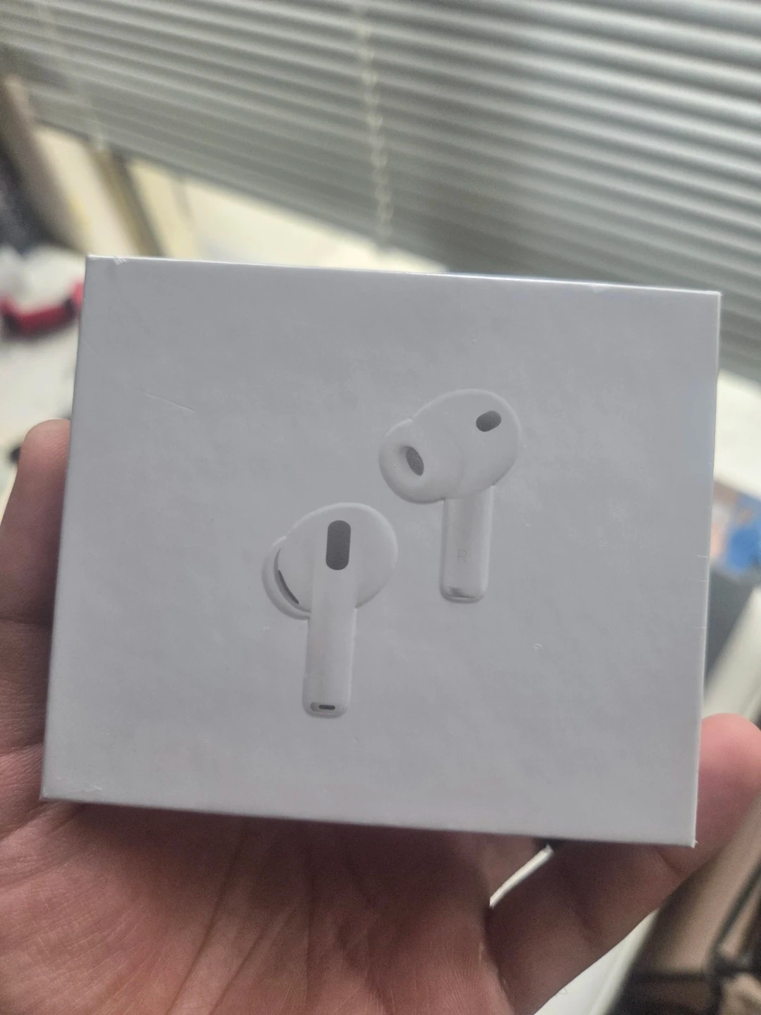 Wireless earphones with charging case, includes five ear tip sizes. Compatible with USB-C, Apple Watch, MagSafe, and Qi-certified chargers. Designed by Apple in California. Product of China.