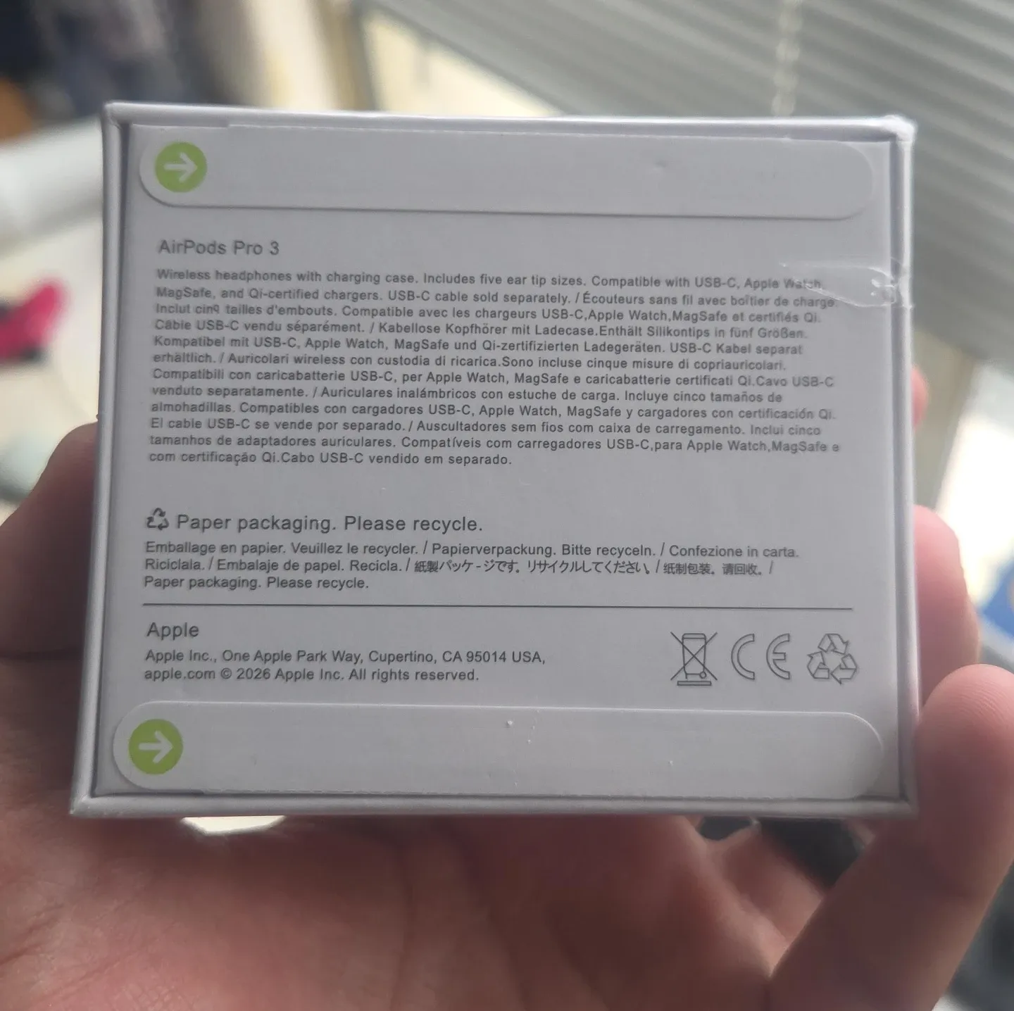 Wireless earphones with charging case, includes five ear tip sizes. Compatible with USB-C, Apple Watch, MagSafe, and Qi-certified chargers. Designed by Apple in California. Product of China.