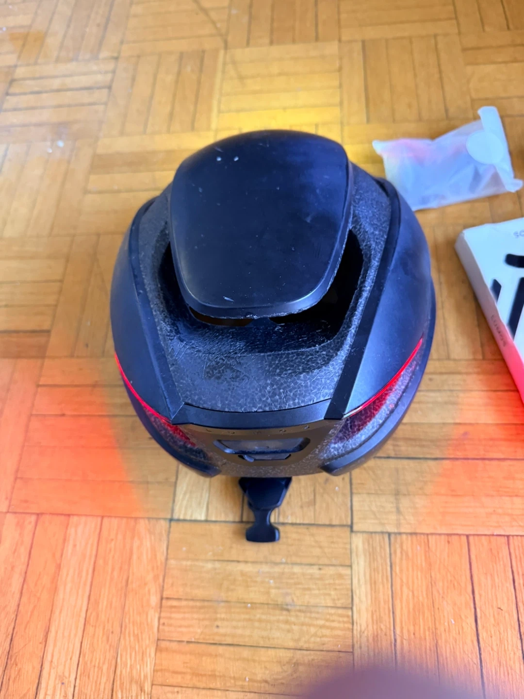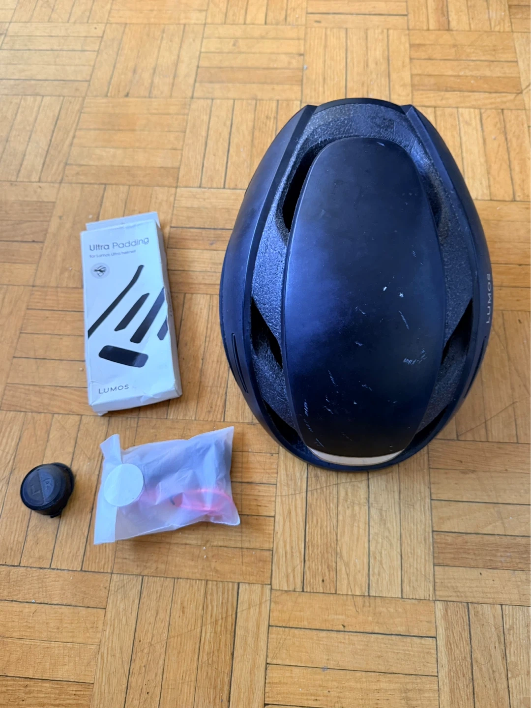 Lumos helmet with front and back lights and signal lights. It comes with a remote control (which is new) on the handlebar to signal left or right, as well as replacement padding. Size M/L