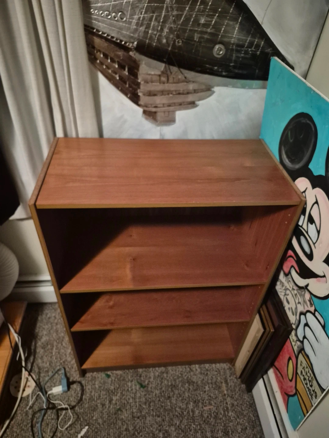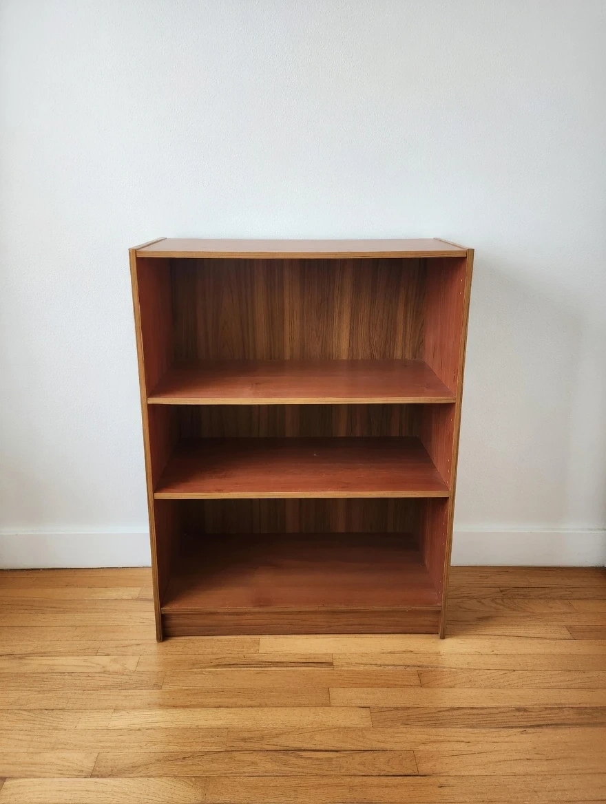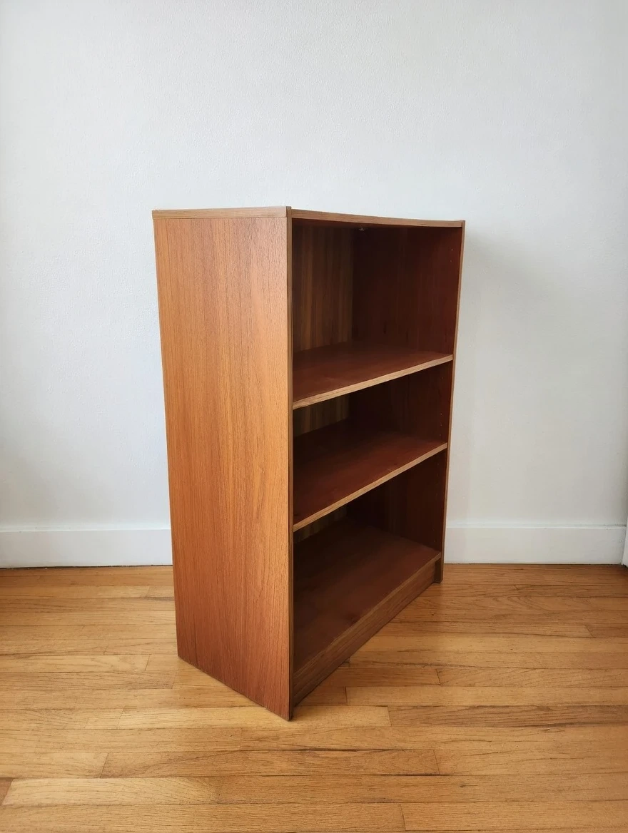 Three tier bookcase with a teak veneer finish. Great for storing books or display items. Two small strips of veneer are missing on the top side edges (visible in photos). This is purely cosmetic and does not affect the structure or usability of the shelf.
