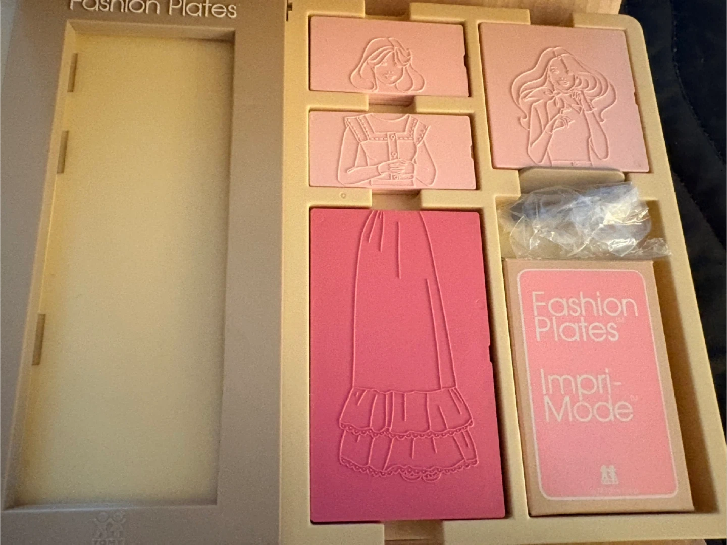 Selling a vintage Fashion Plates Impr-Mode by Parker. This kit helps young designers create fashions with hundreds, thousands, even millions of fashionable combinations that can be created. It includes the plates and colored pencils. Box is included!