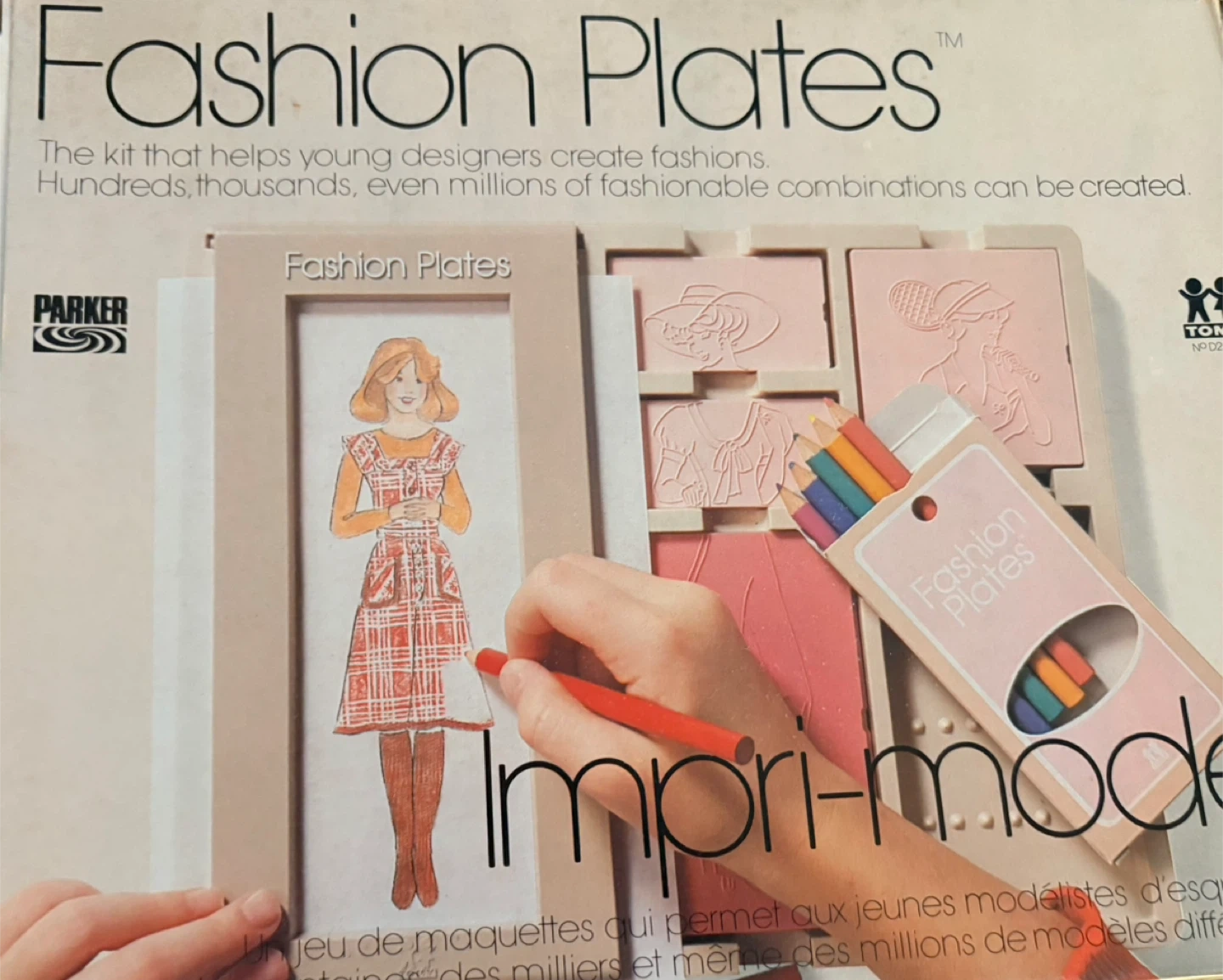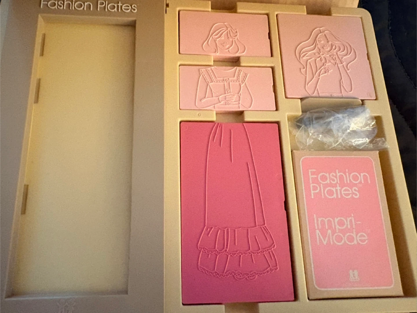 Selling a vintage Fashion Plates Impr-Mode by Parker. This kit helps young designers create fashions with hundreds, thousands, even millions of fashionable combinations that can be created. It includes the plates and colored pencils. Box is included!