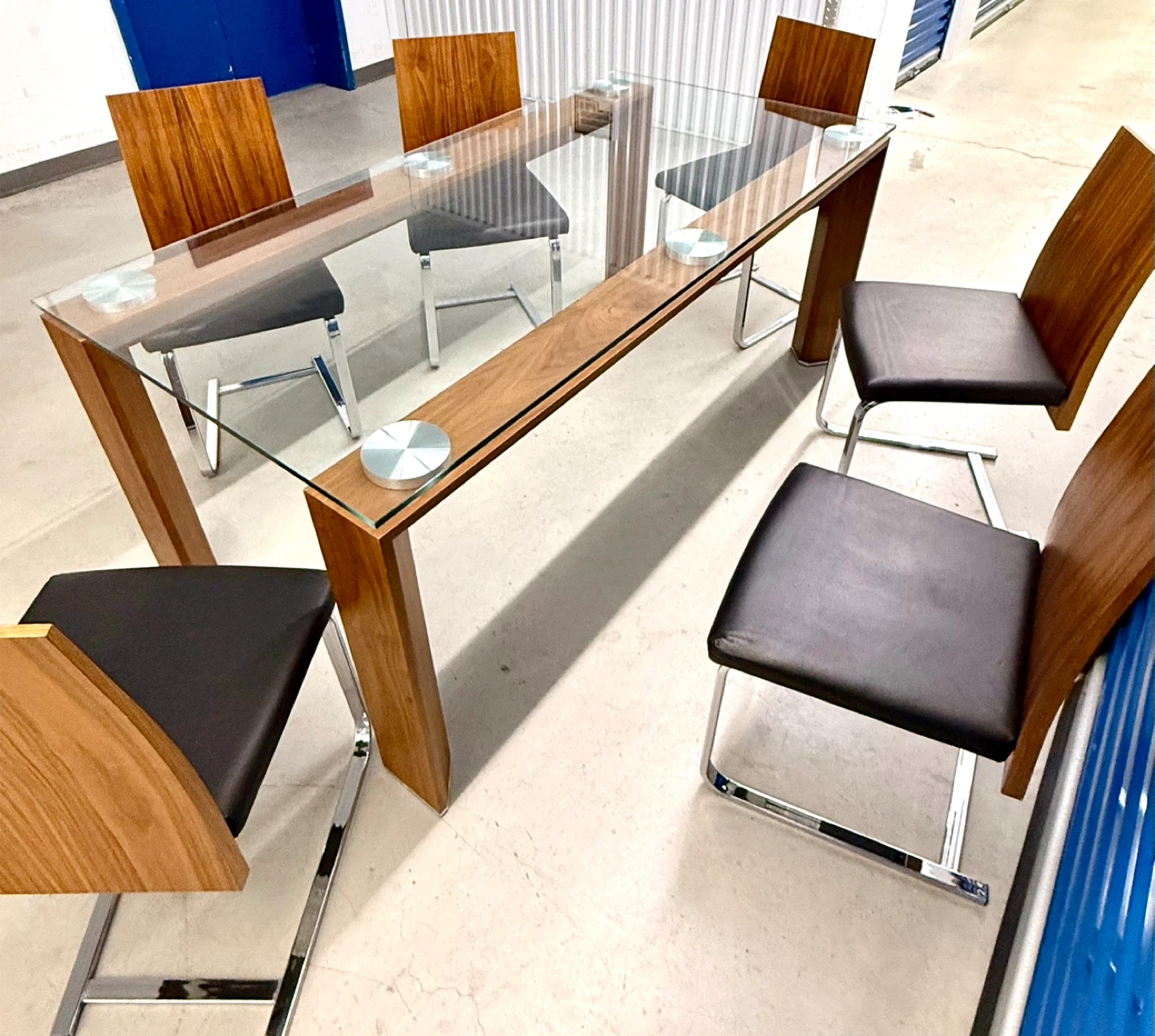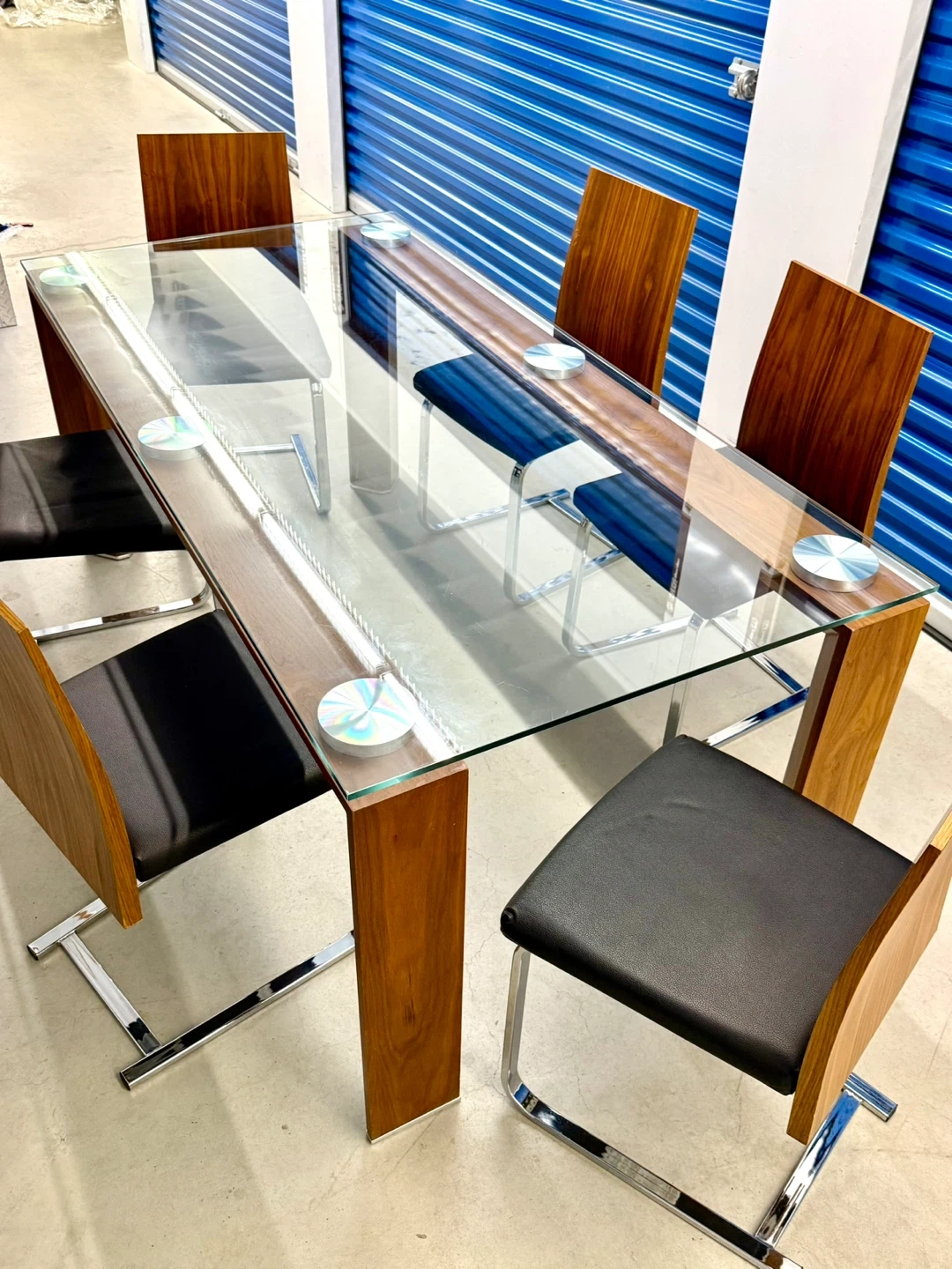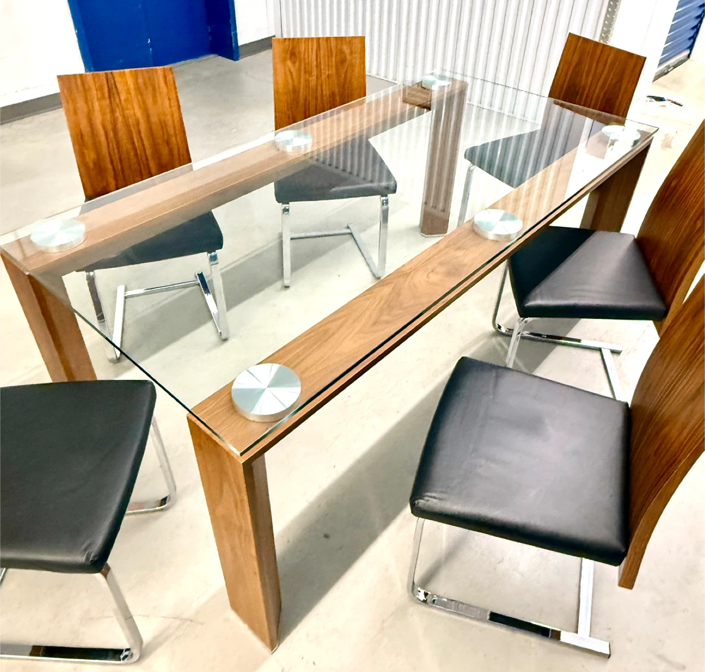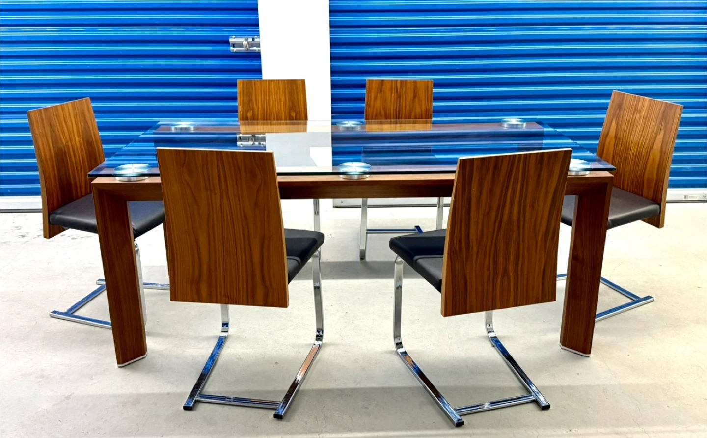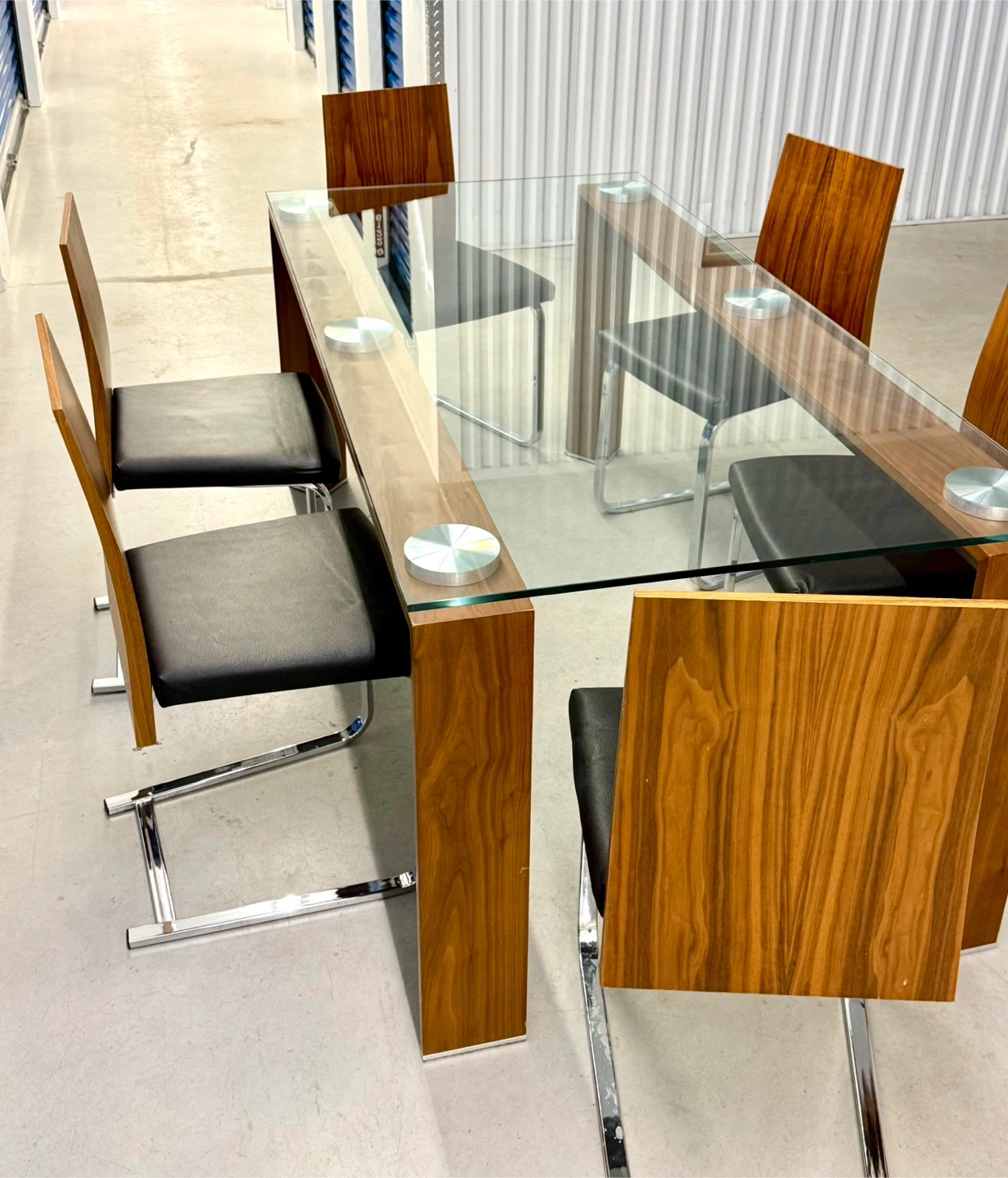 A stylish glass-top dining table with a wooden base and six chairs. The chairs have black upholstered seats and wooden backs with chrome legs. It's perfect for family dinners or entertaining guests.