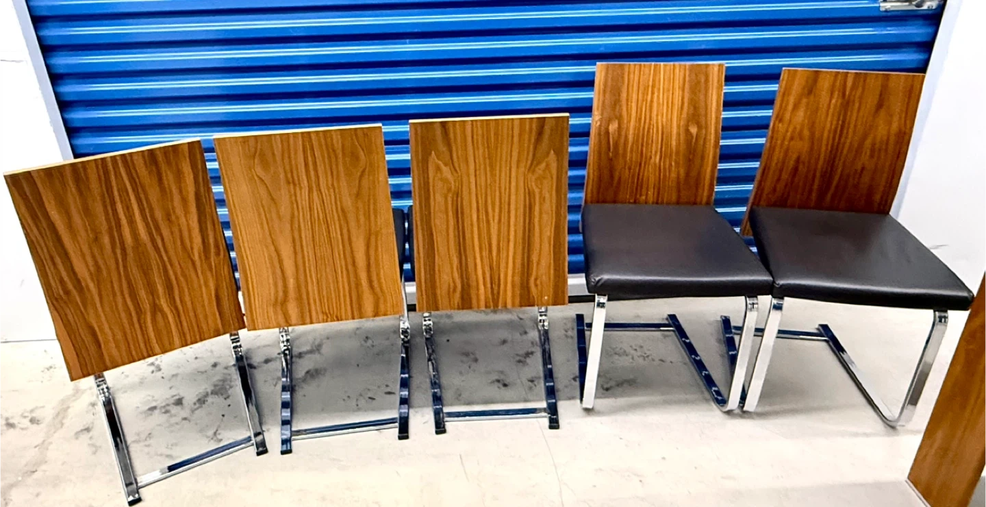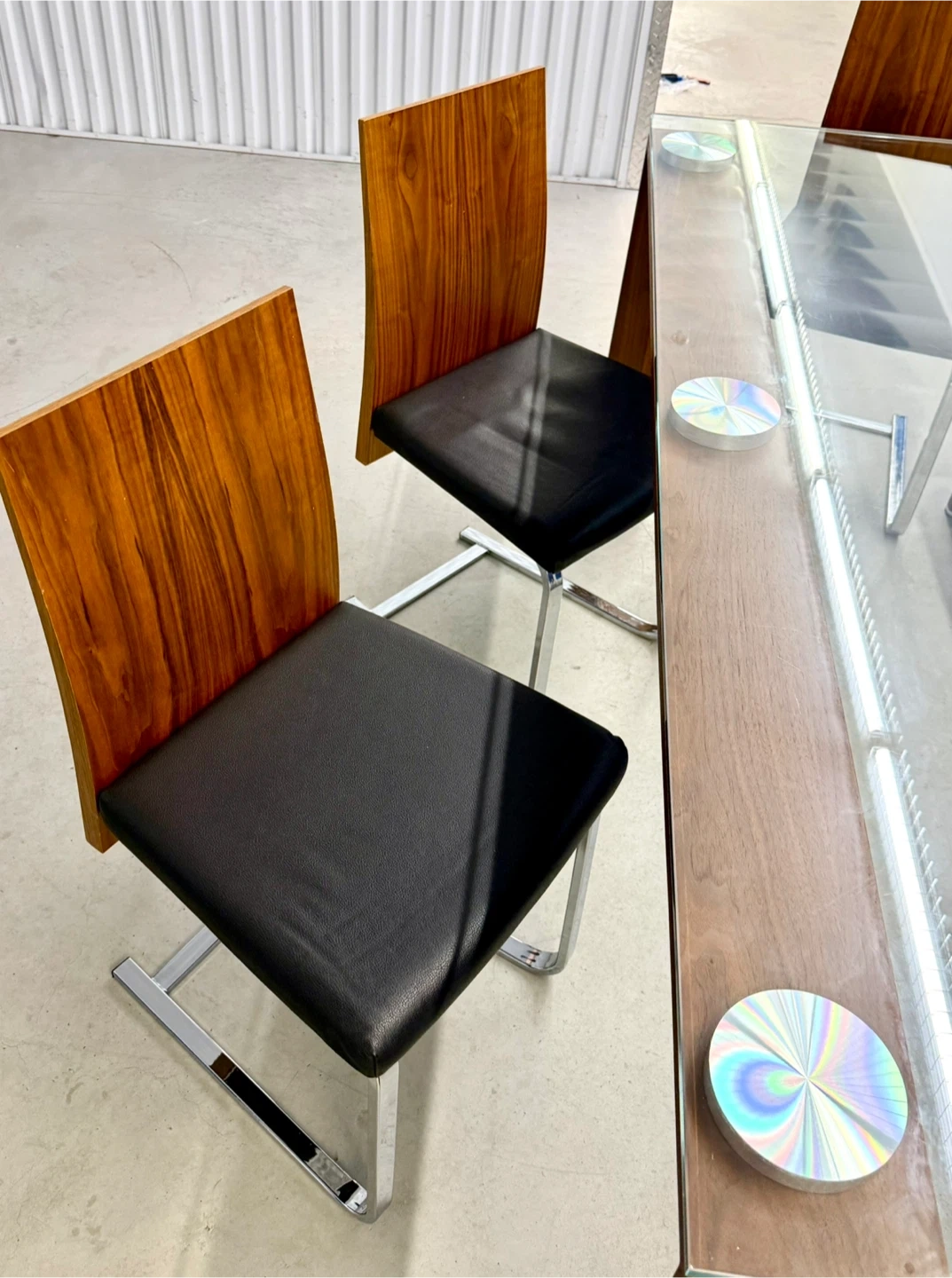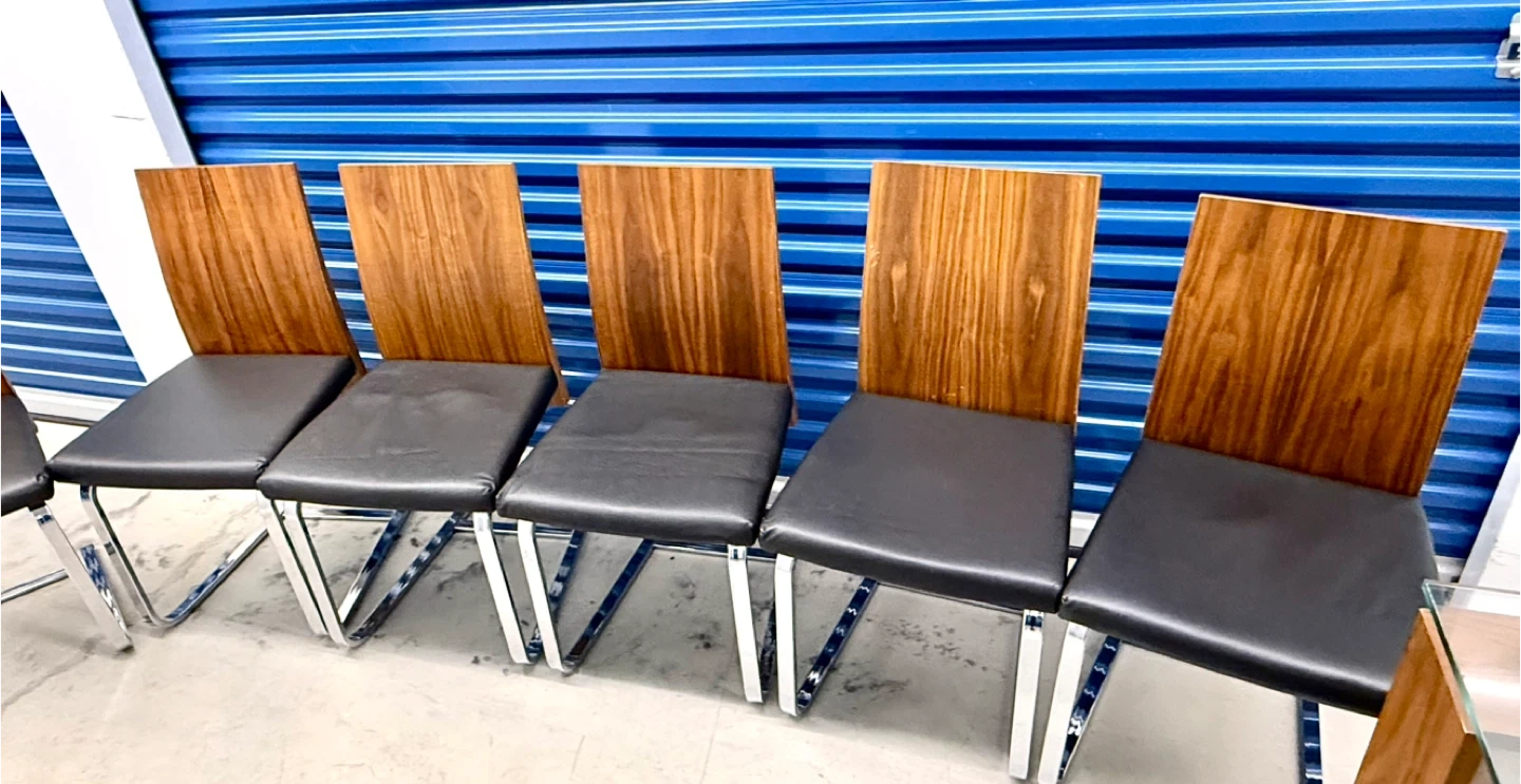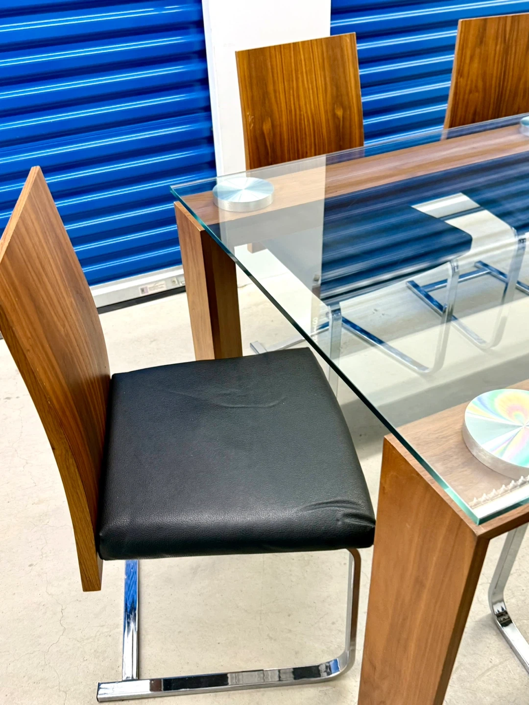 A stylish glass-top dining table with a wooden base and six chairs. The chairs have black upholstered seats and wooden backs with chrome legs. It's perfect for family dinners or entertaining guests.