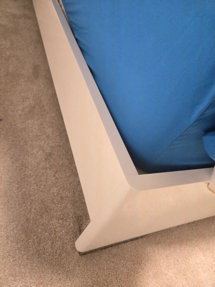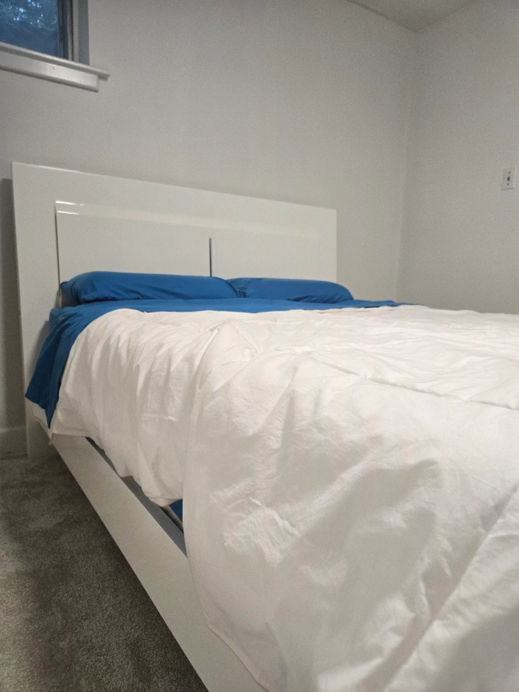 Selling a bed frame with a white headboard and base. It comes with a queen sized mattress. Perfect for a bedroom refresh!
