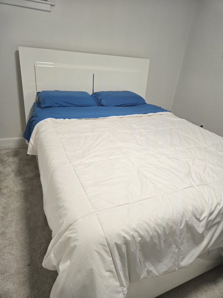 Selling a bed frame with a white headboard and base. It comes with a queen sized mattress. Perfect for a bedroom refresh!